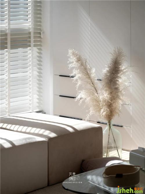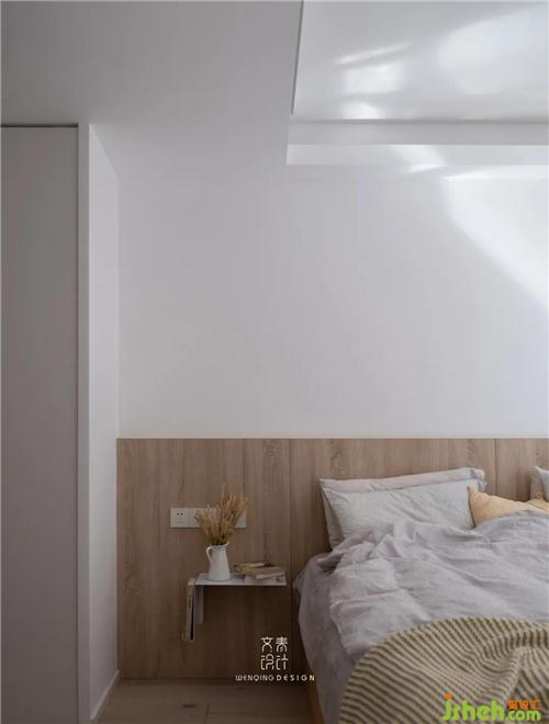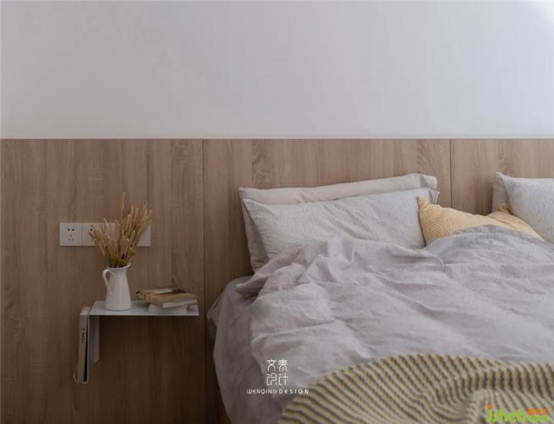 卧室延续客厅设计风格,原木与暖白两色交织,让卧室的氛围回归安静舒适。采用铁艺置物架代替传统床头柜,放上几本睡前读物,杭州装修设计睡前也能满足精神食粮。