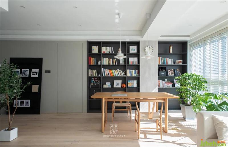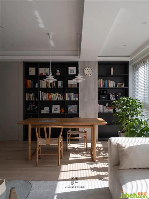 客厅另一侧则改造成家中的开放式书房,我们将墙体往主卧内推,定制内嵌式开放书柜,原本突兀的承重柱,刚好切断满墙书柜的压抑感,创造了视觉上的呼吸点。