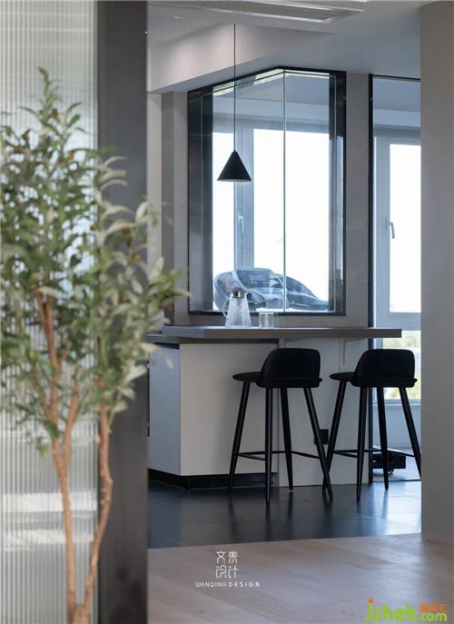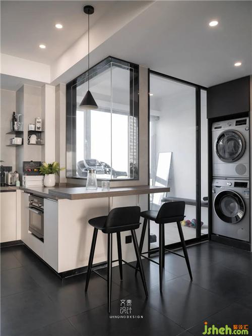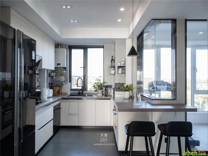 健身房与厨房仅一玻之隔,借助玻璃的通透性增加厨房采光性,在吧台用餐时也能欣赏窗外的风景,视觉味觉双满足。