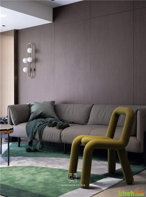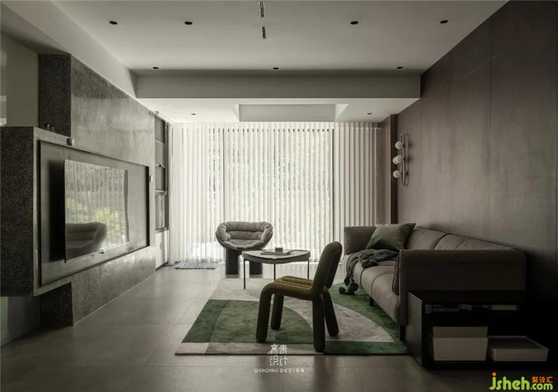 这是客厅最好的视角,靠落地窗的吊顶用造型做了“假天井”,不仅骗过眼睛让层高看上去更高,吊顶之间错落的造型,也让顶面充满层次感,包括水磨石材质的几何电视机背景墙,每一处设计都在用线条塑造空间。