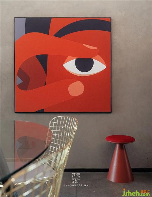 餐厅边上布置了干区洗手台,墙面充满水泥质感的艺术涂料,让空间更硬朗,但灰色与柔和暖黄