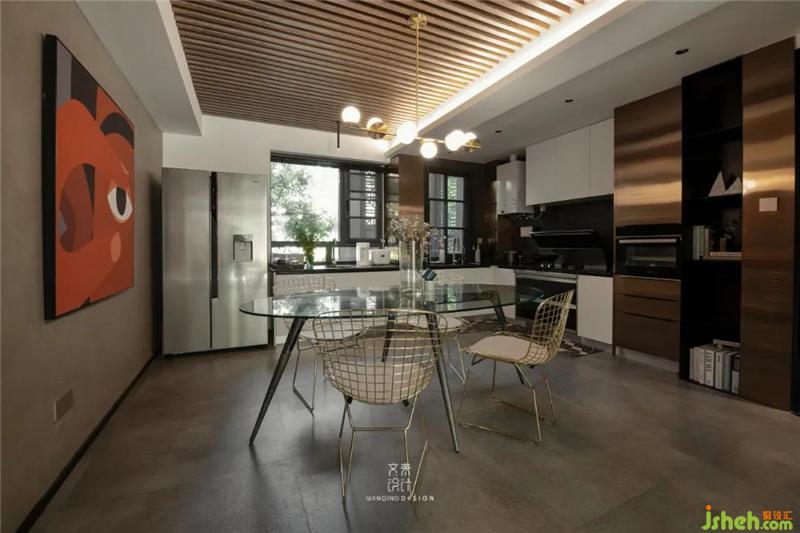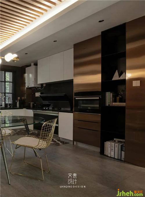 入户就能看到餐厅空间,金色不锈钢装饰的高柜与餐椅遥相呼应,吊顶同样采用了错层设计,两边较低的部分刚好可以隐藏灯带,中间部分用木作营造线条感,视觉上也能得到拉伸。