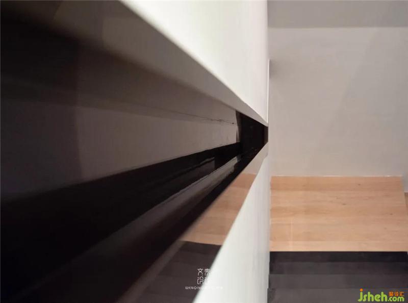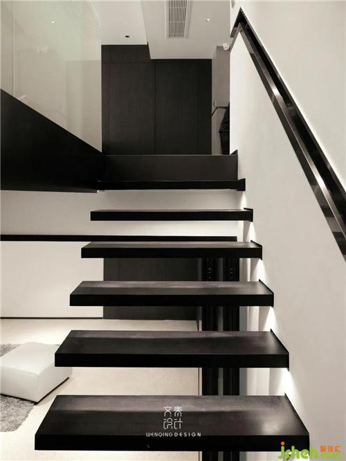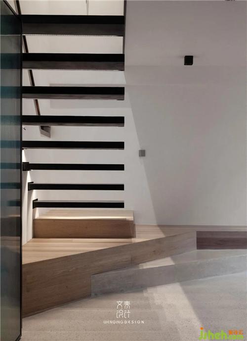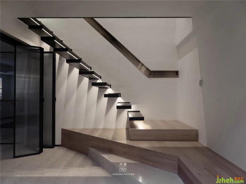通往地下室的楼梯采用悬浮式设计,悬浮在半空的楼梯宛如一件精致的艺术品,内嵌暗藏式扶手、轻盈的踏步结构,既能节省空间,还能起到装饰效果杭州装修设计。