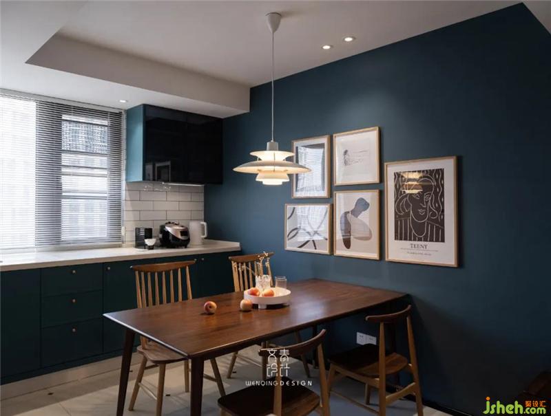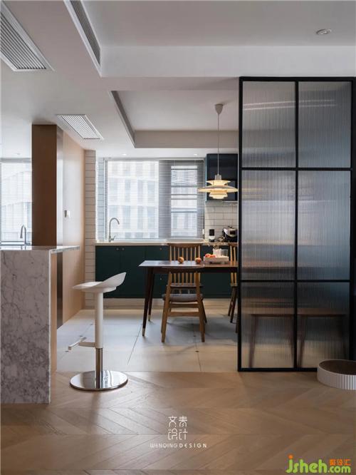 为了实现餐厨一体,我们将原本的房间改成了现在的餐厅,靠窗区域原本是房间的飘窗,按照餐边柜的高度,定制了现在西厨餐台加餐边柜的设计。