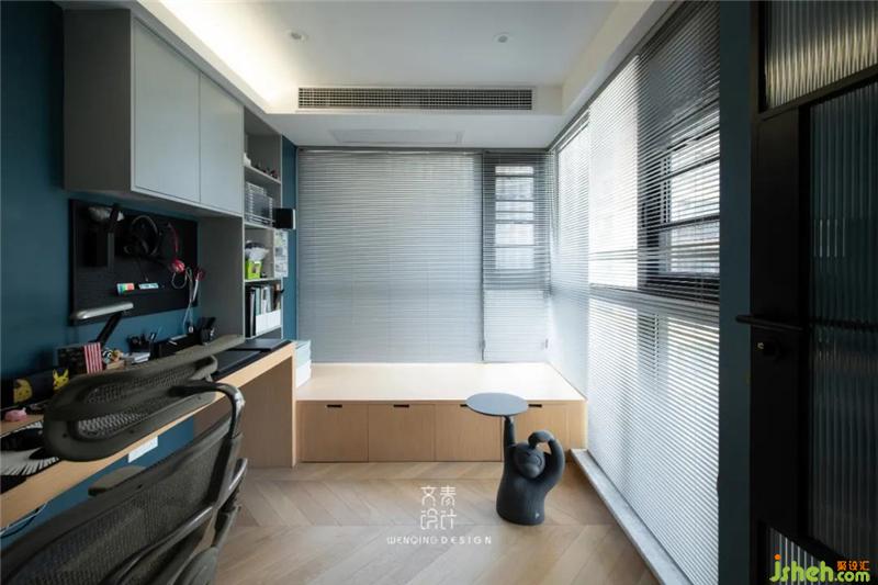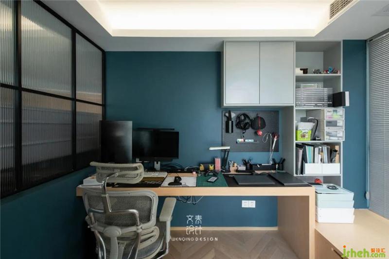 玻璃电视背景墙推门而入,就是业主平时工作休闲的书房。