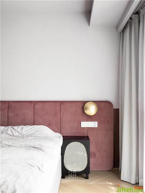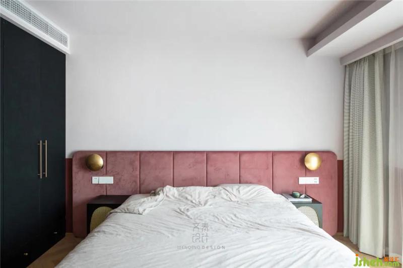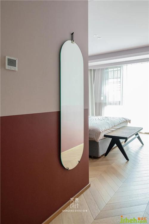 卧室用砖红色乳胶漆刷至半墙,与床靠背交错所产生的视觉变化,仿佛在宁静的空间中,杭州装修公司注入了些许层次丰富的变化。