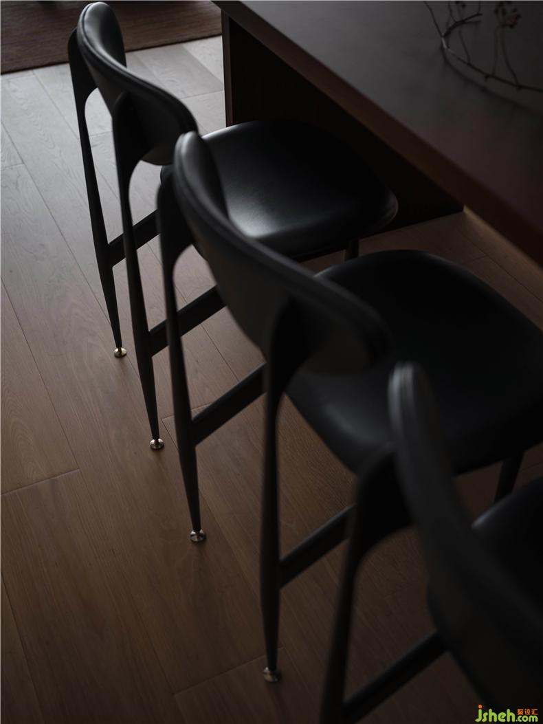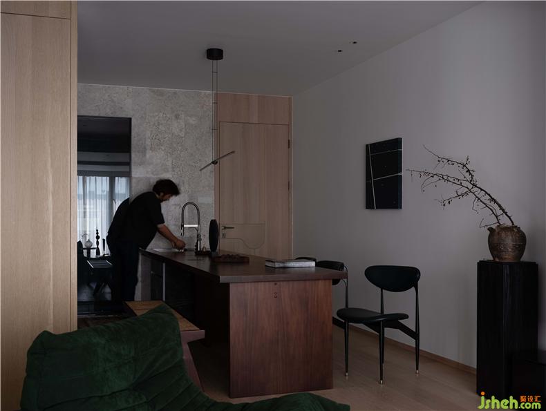 厨房的操作台外移,与餐桌结合在一起,形成长达3米7的大长桌,不仅可以洗菜备餐,更可以作为吧台、餐桌甚至办公桌使用。长桌如同厨房的纽带,与其他空间自然相连,消除了空间区域性的阻隔,将美食与生活串联。在这里,不仅可以与朋友随时畅享“偷得浮生半日闲”的下午茶时光,还可以在准备美食的期间,与家人进行亲密交流和互动。