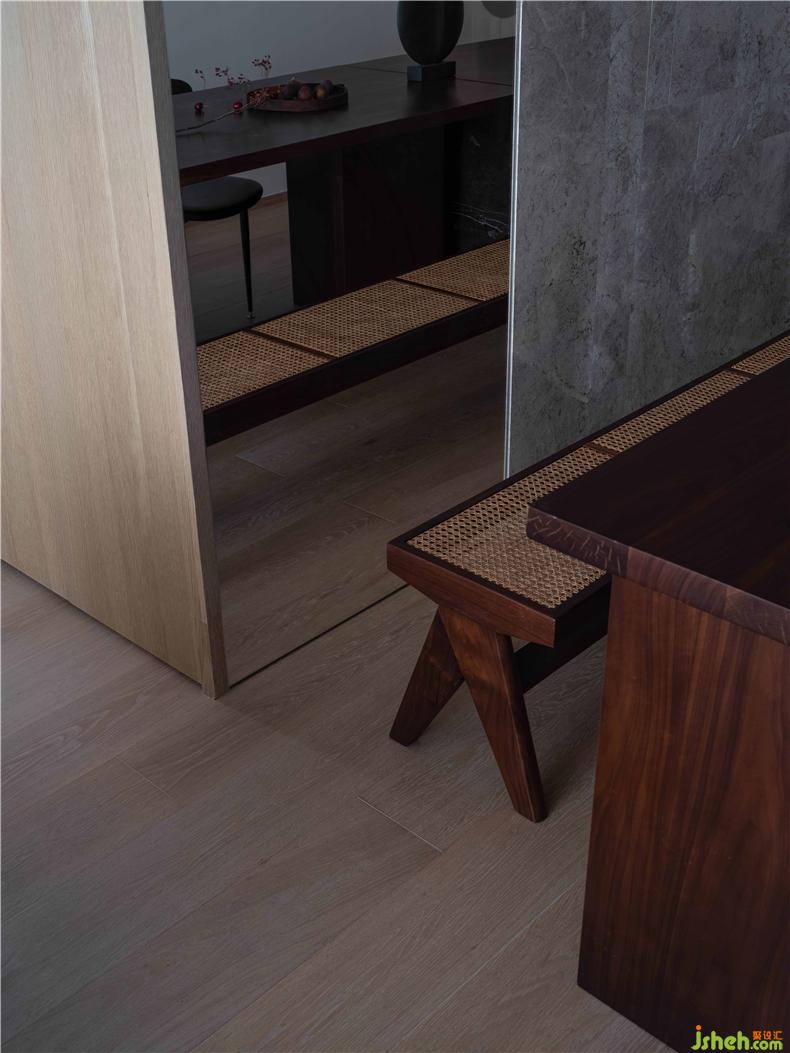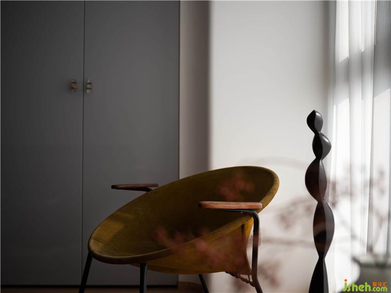 自宅的特殊性,要求设计师在考虑空间功能性的同时,聚焦于生活的私密性。次卧的卫生间还巧妙地设计了两个入口,其中一门与小阳台连接,在有客人到访时,次卧直通的卫生间门便可关闭,小阳台的门开启,将次卫临时转换为方便使用的公卫。开放和私密,便在两扇门的转换中轻易完成对接。