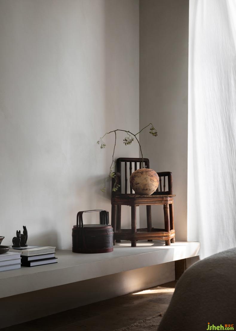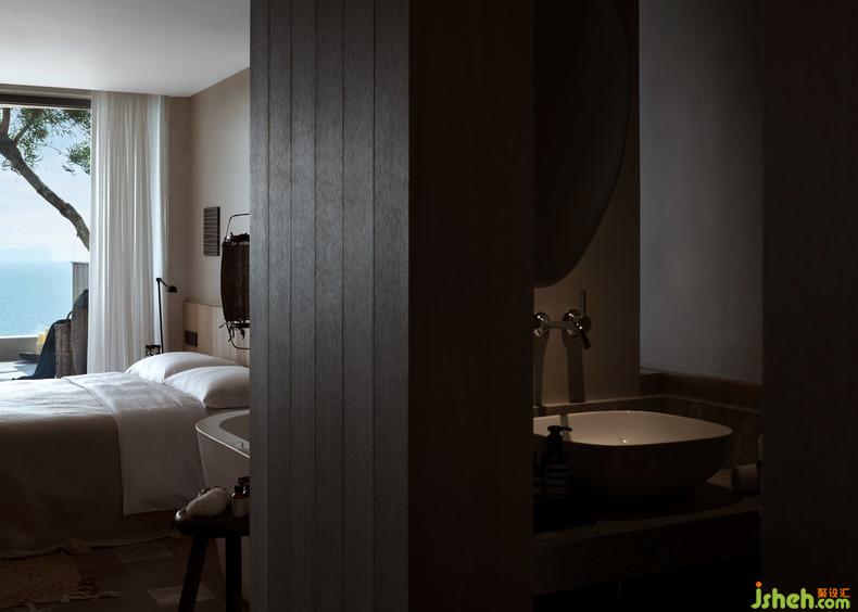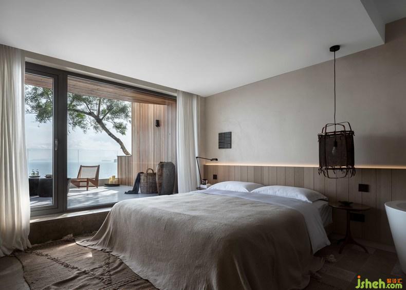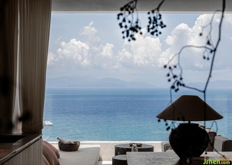 肆意延伸的树枝,将空间做了个虚晃的划分,与不远处绵延的海景一同,创造了雾里看花水中望月的朦胧效果,萌生出暧昧的情愫。隐藏在空间中的素色座椅,低调处理着与空间的关系,又以其特有的材质,柔软了远道而来的旅人的内心。