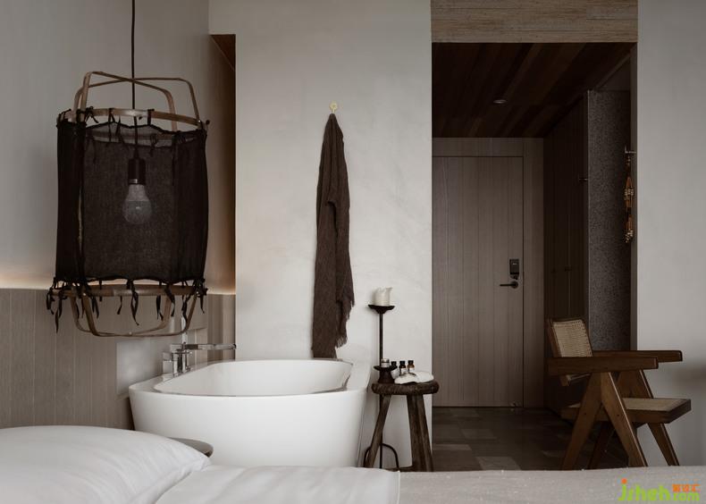 接待区的酒吧,将整个空间的氛围定调,悠然与闲适感从进入的那一刻便升起。考虑到酒吧自带的慵懒喧闹的氛围,酒店设计师在空间的设计中更为克制,以沉寂的色调搭配质朴的肌理,为整个空间注入一道以静制动的韵律。不是觥筹交错间的迷离茫然,而是“海上生明月,天涯共此时”的浪漫自在,用艺术的形式赋予生活仪式感的体验。