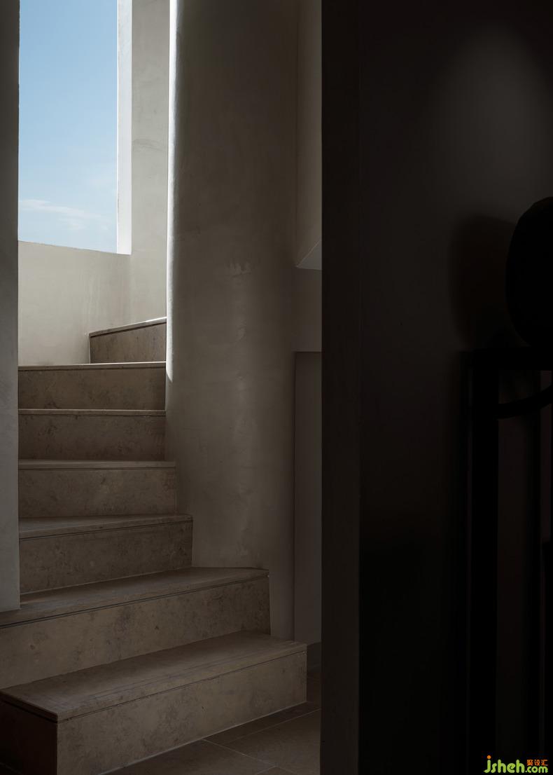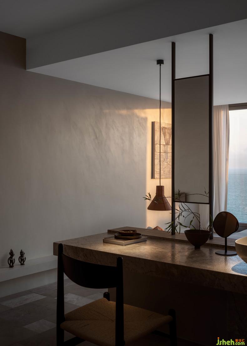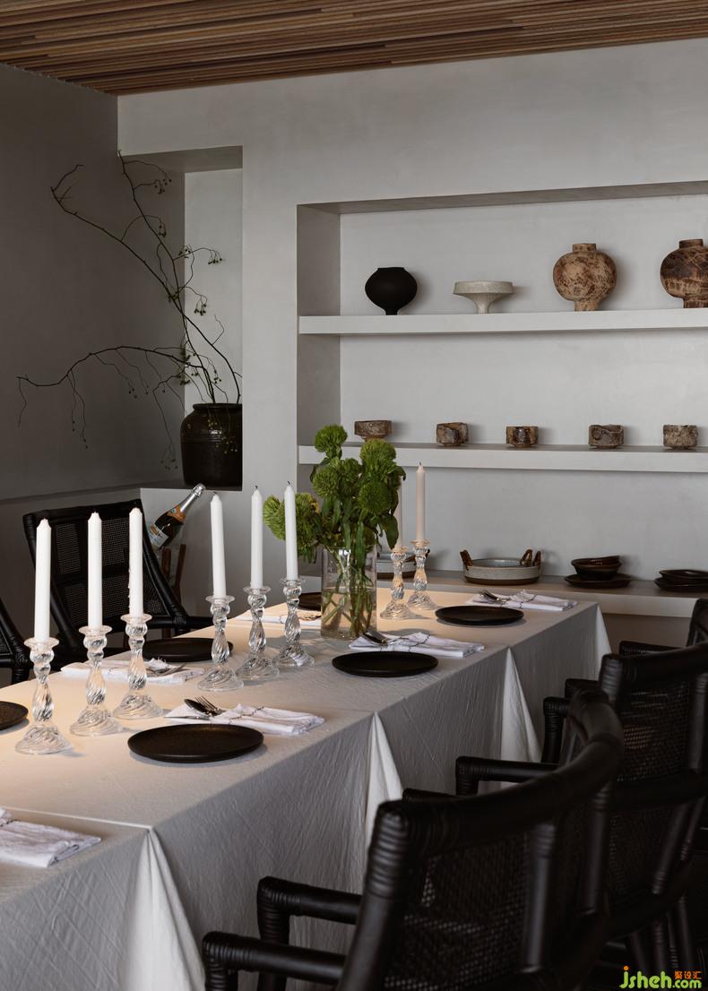 餐厅位于接待区下方。承接而下的楼梯小径,带着点古堡神秘的味道,将人引入一片拙朴而典雅的氛围。酒店设计空间以留白为形式主题,通过陶器、木饰天花板和大理石桌的设置,保留整体的干净与简单。一器一物,一茶一饭,生活的动人,往往就在于不着痕迹却又恰到好处的细节之中。