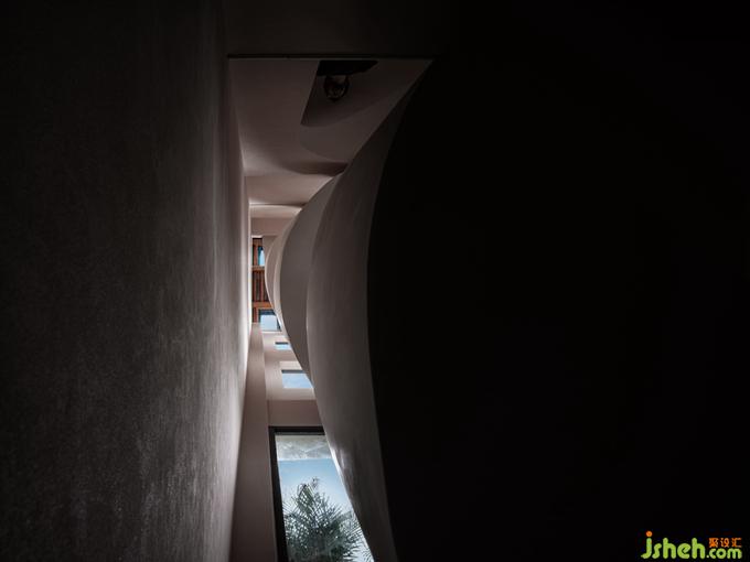 不同于外在的白色主色调,楼梯内裹的一抹朱色,为空间注入一分清新的亮度,带来了年轻感与活力。却又因添加的那一点桦色的沉淀,而多了一分克制的内敛,将整个颜色的亮度下压,达成了空间色系的平衡。酒店设计