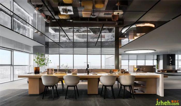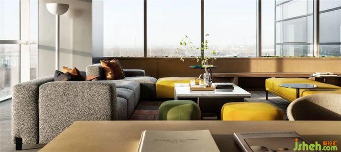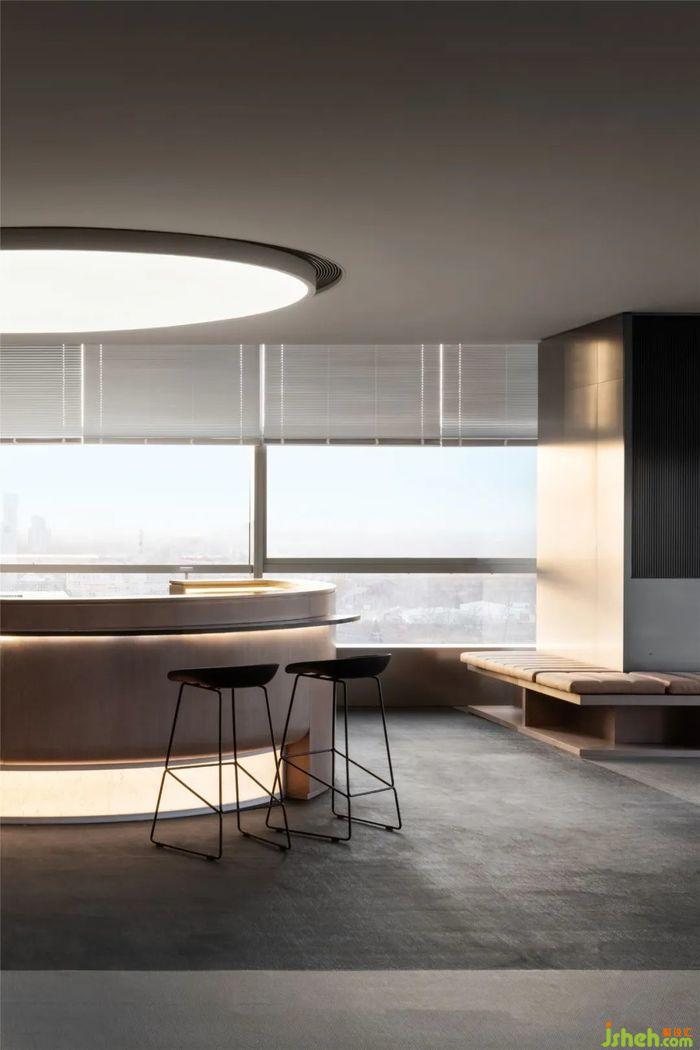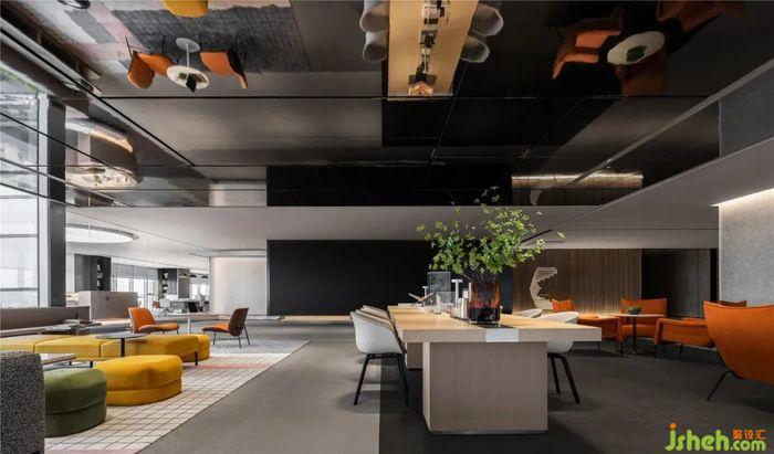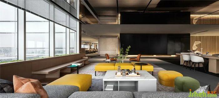 在整体风格不变的情况下,也添加了不同风格的空间语言,如弥漫咖啡香的空中水吧台,办公展示中心设计落地窗前洒满阳光的软垫卡座,都让空间充满变化性与趣味性。