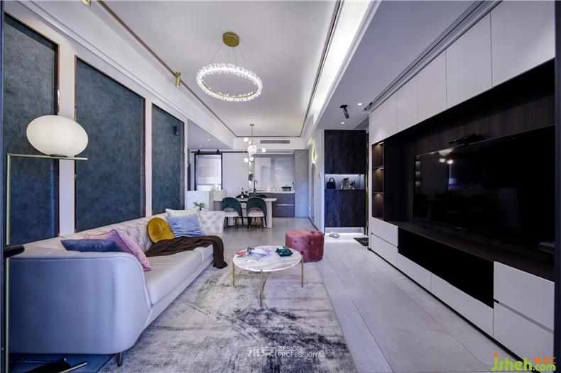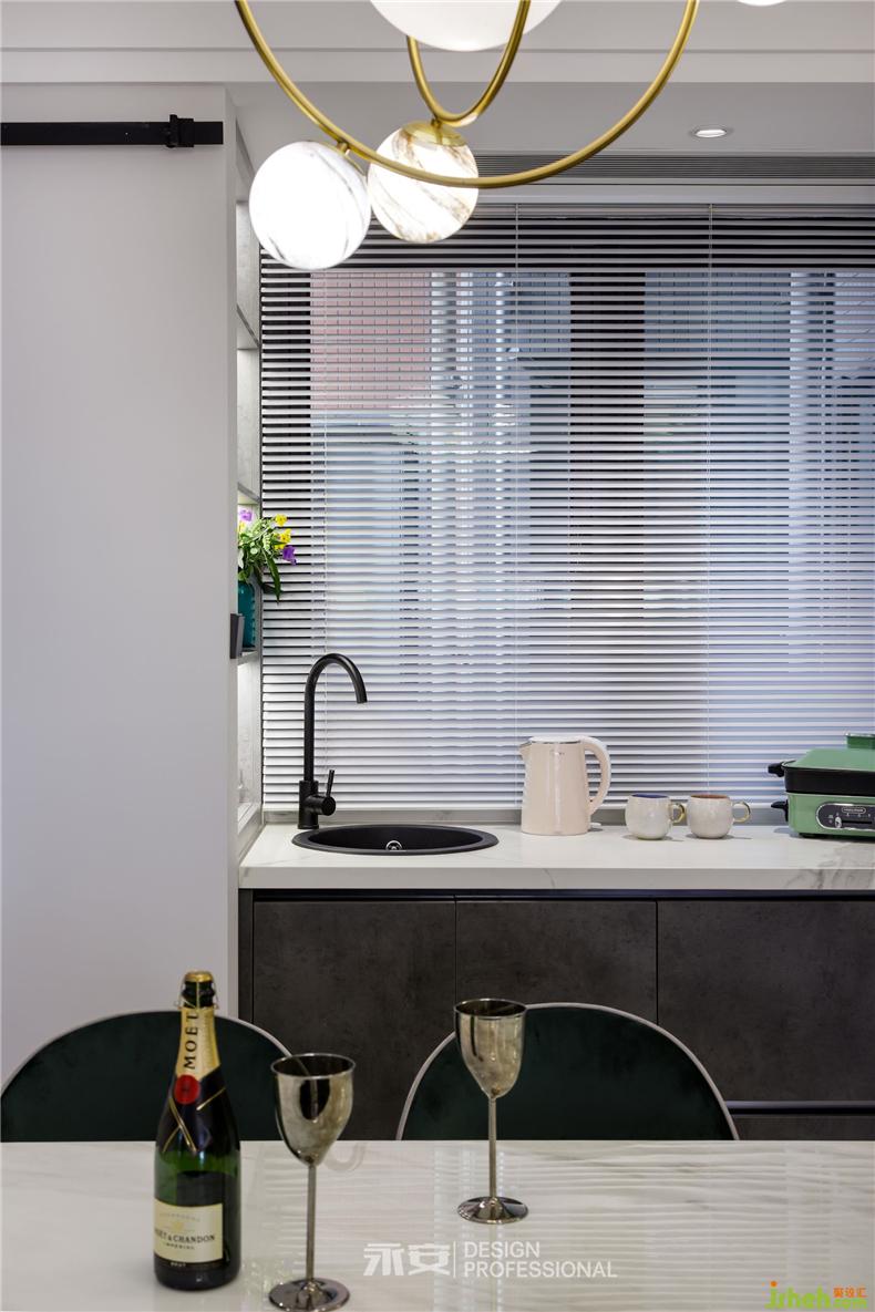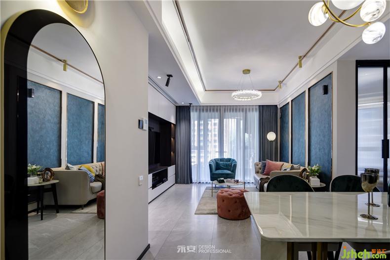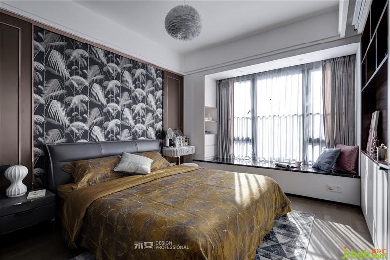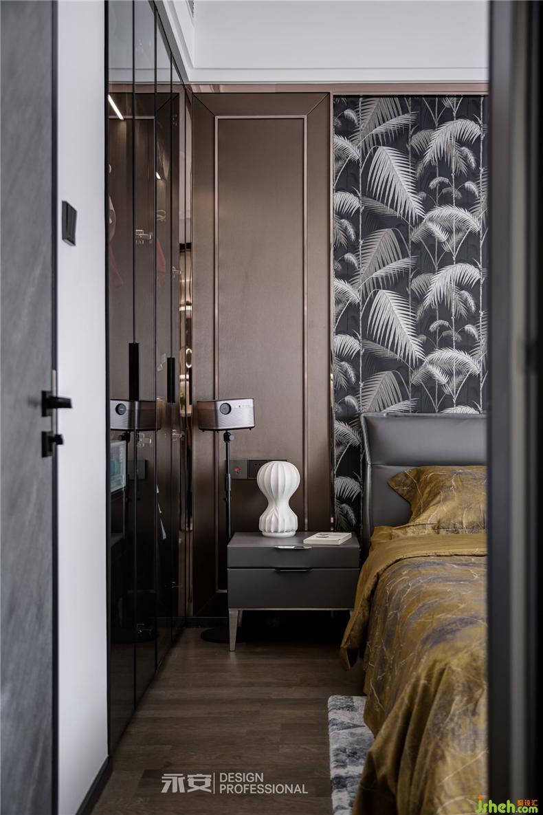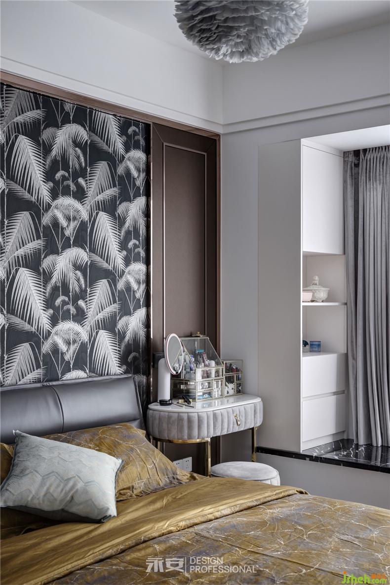床头是自然生趣的凤尾竹巨幅壁画,搭配两边咖啡色的饰面板,加上质感十足的黄铜框线进行装点,呈现出一种古朴而又精致的美感。在此之下,是暗金色的被单与枕套,奢华而又舒适,善于享受生活的人自然不能在枕头与被套上委屈自己。吊顶灯的外形犹如一团漂浮着的羽毛,打开灯时,光线从羽毛间的缝隙中射出,整个主卧在这一缕缕光线的照耀下熠熠生辉