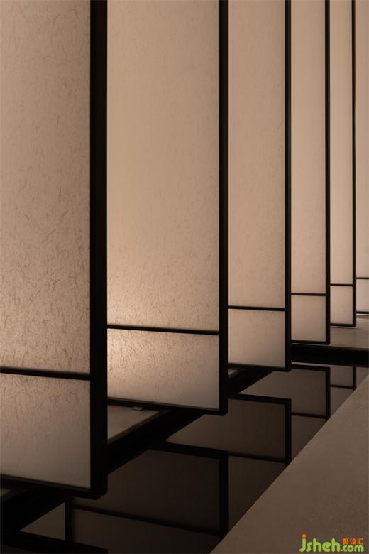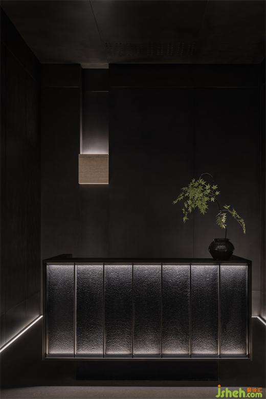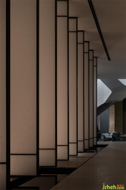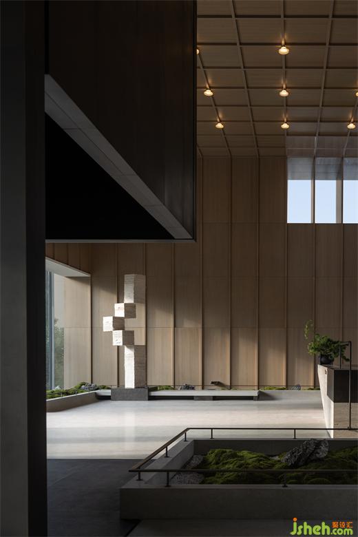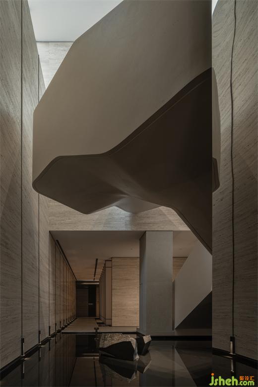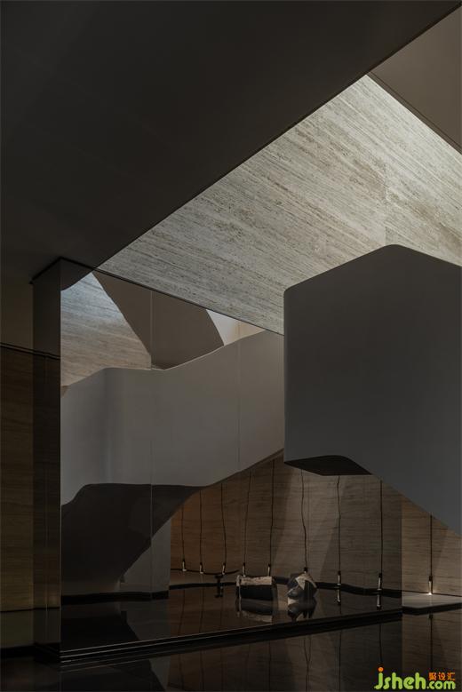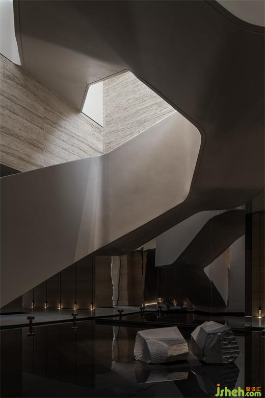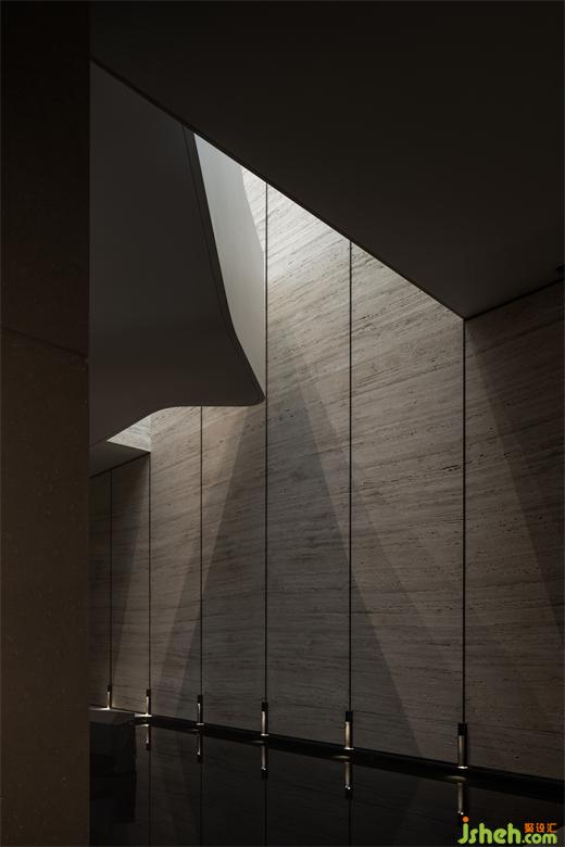 曲折迂回,幽闭与开敞之间戏剧性的转换成为空间的主旋律。行至后场,豁然首见通透玉石,隐示空间转入温润高雅之境。空间的转折变幻,营造出人、空间、环境之间的互动关系。幽暗之处,令人专注;而开敞之时,又使人心境豁然开朗,相互衬托,形成对比与和谐的统一。