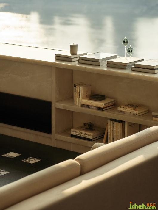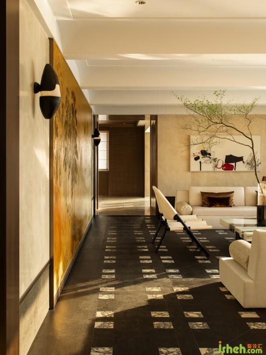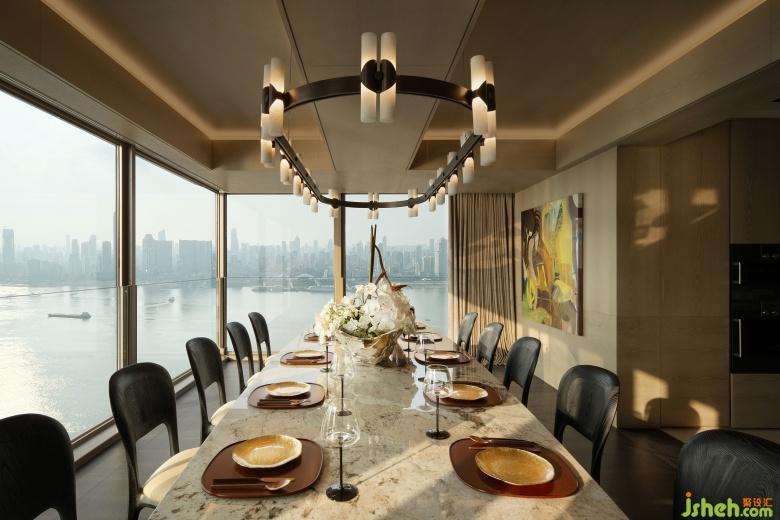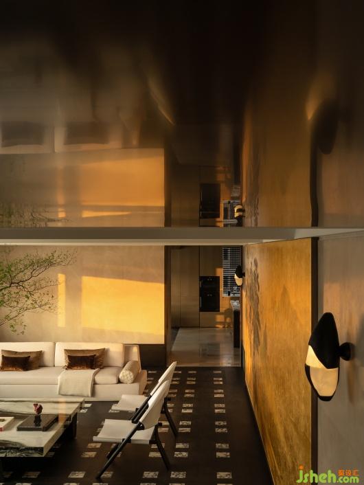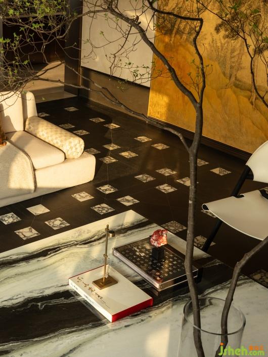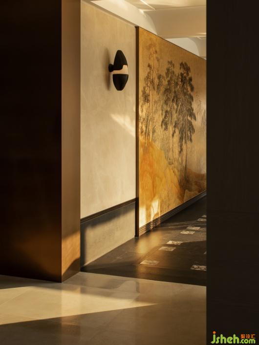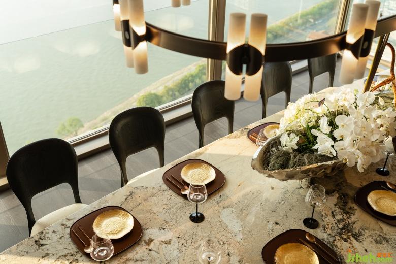 一面是金箔山水的静穆,一面是窗外城市江景的繁华,古代与现代、东方与都市,以浓烈的色彩,激发了空间中的写意。前方,朱岚的水墨画《无题》有着丰富且变化的线条,看似无定式的作品状态,因角度或瞬间的不同而与空间产生共鸣,成为浪漫生活故事的节点。