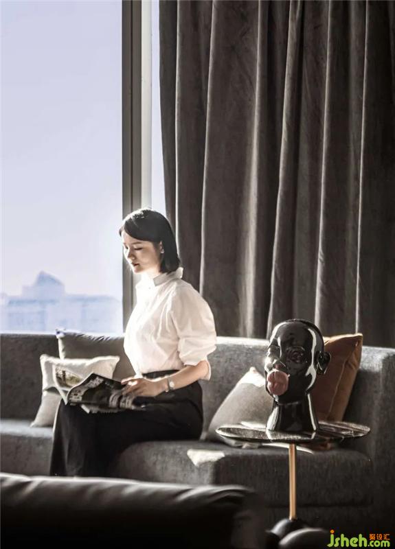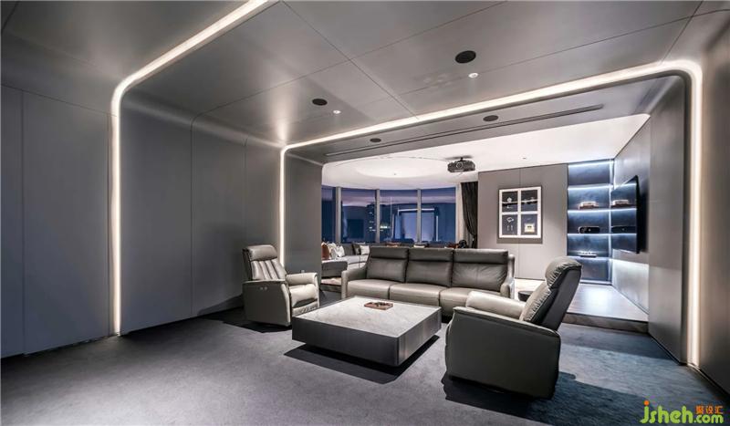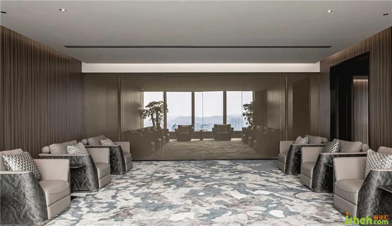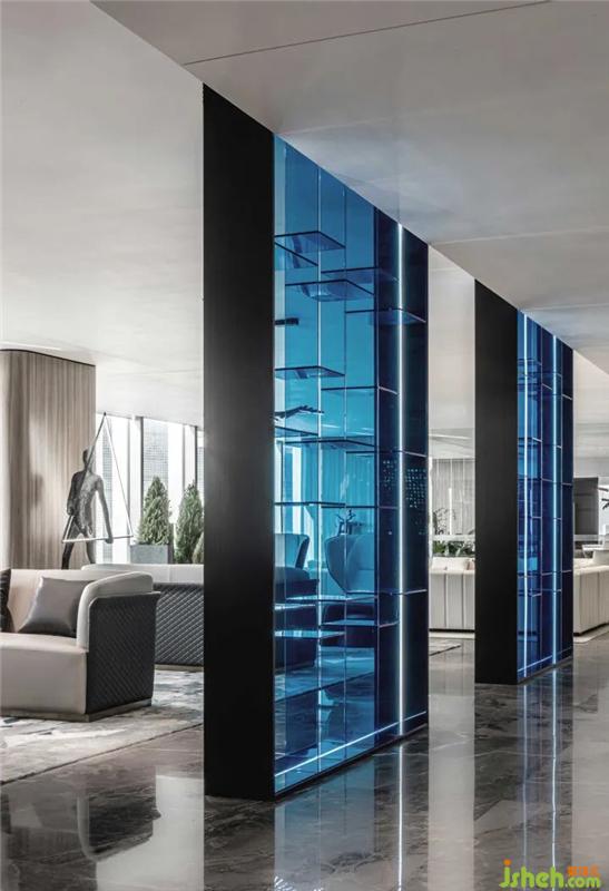 简洁利落的黑色钢板则带给人冷静的现实感,形成包容而实在的交互空间。冰点蓝、稳重黑、轻奢白为主、思想灰为辅的色系,加之地毯、软装的营造,烘托出似有云层、有河流的丰富自然空间.....