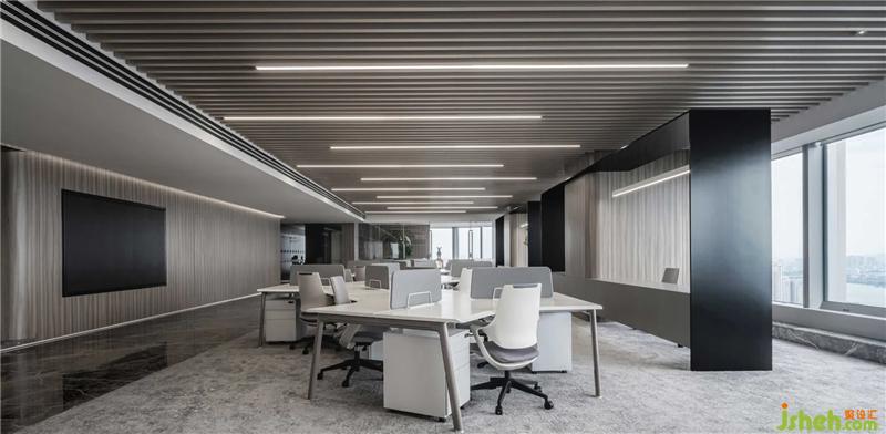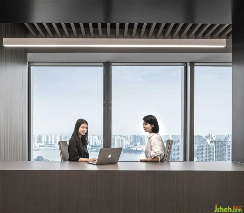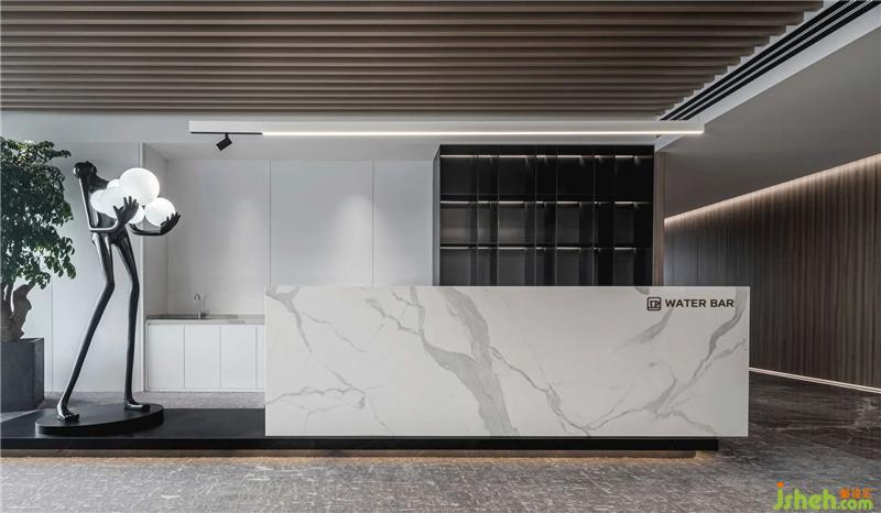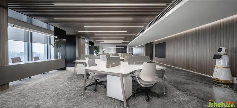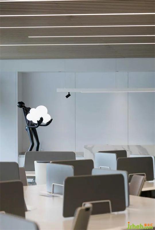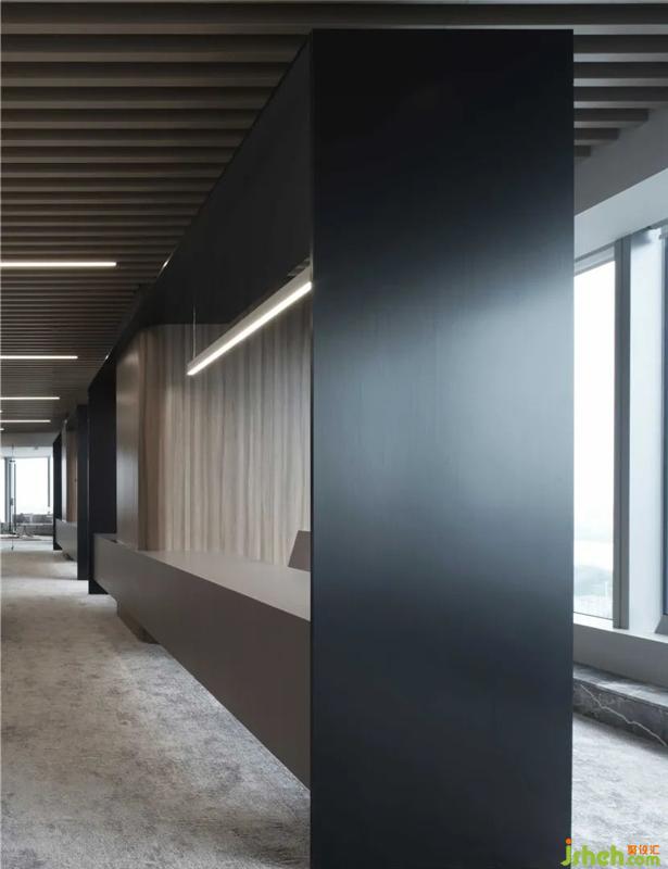 经纬交织的大理石,云蒸霞蔚的地毯,幻化出一个有天空、云朵、星辰、河流的灵动空间,身处其中,宛如湖水无声流淌,延绵无尽,又如云层随风涌动,与窗外天境融为一体惠州办公空间设计。
