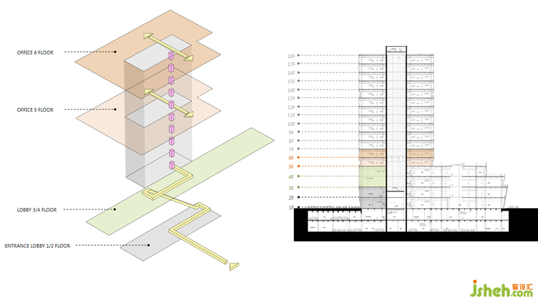 由于不同楼层所承担的不同的功能,本案主要分析4F、5F的办公空间,空间功能多变和重合,以满足和适应各种群体多元化的功能需求。
