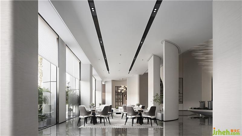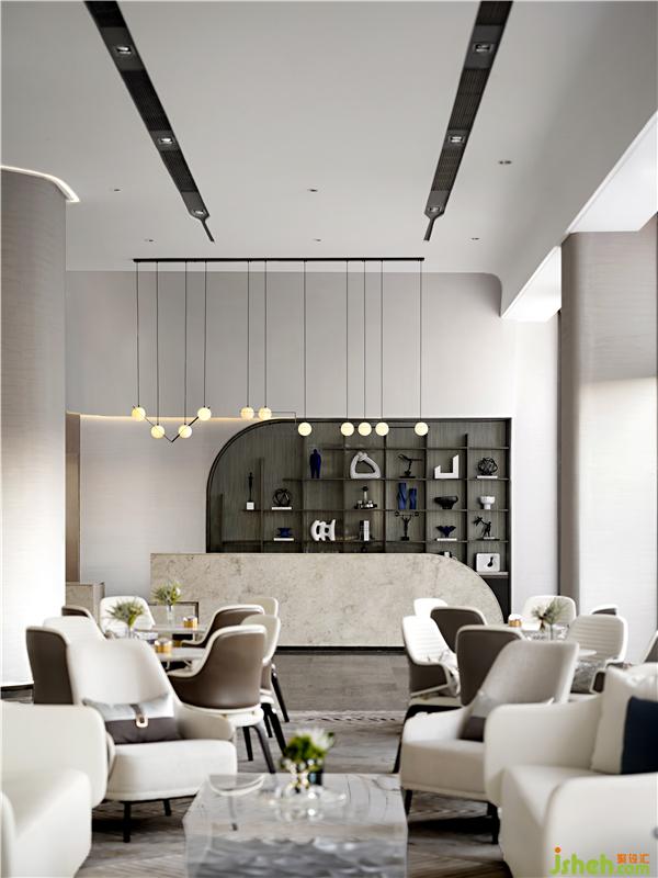 空间以米白色为基调,大胆加入引自静谧蓝为点缀,自然、光影与空间交相融汇,如同清晨阳光洒在江面时的水光潋滟之景,从静谧中感受视觉与精神的心之所向。