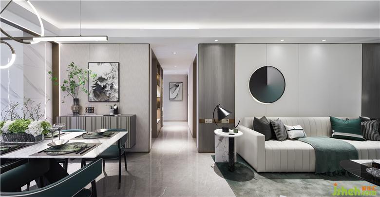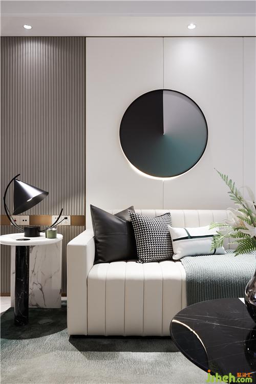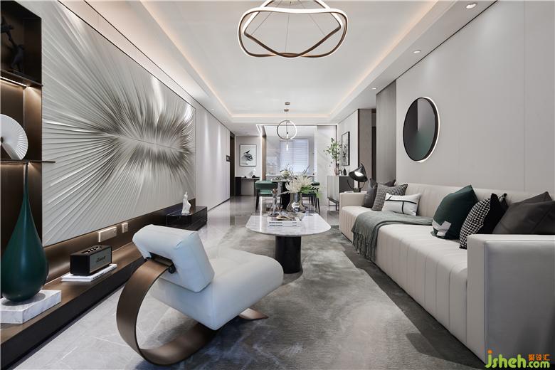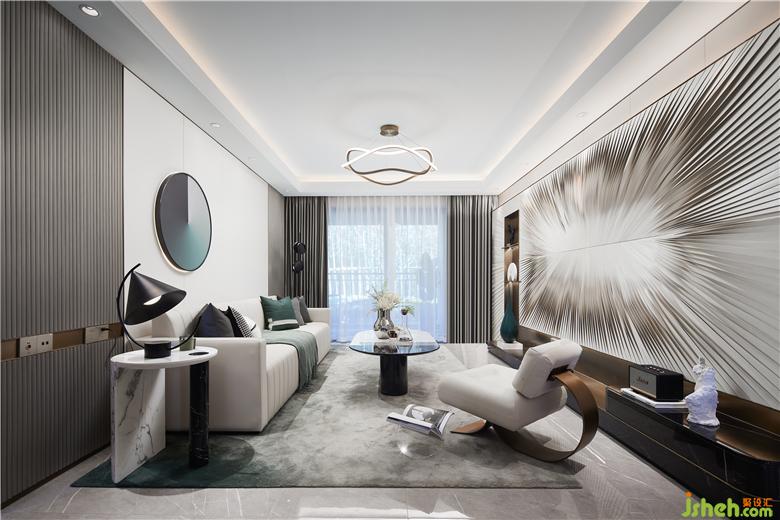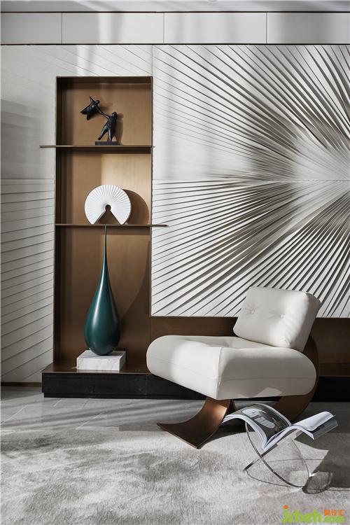 极为利落的肌理在客厅的背景墙上舒张蔓延,雨滴落下,样板房装修设计仿若无声的空间沾染上生命的悦动,带着巨大的张力,涌动着鲜活的生命气息。