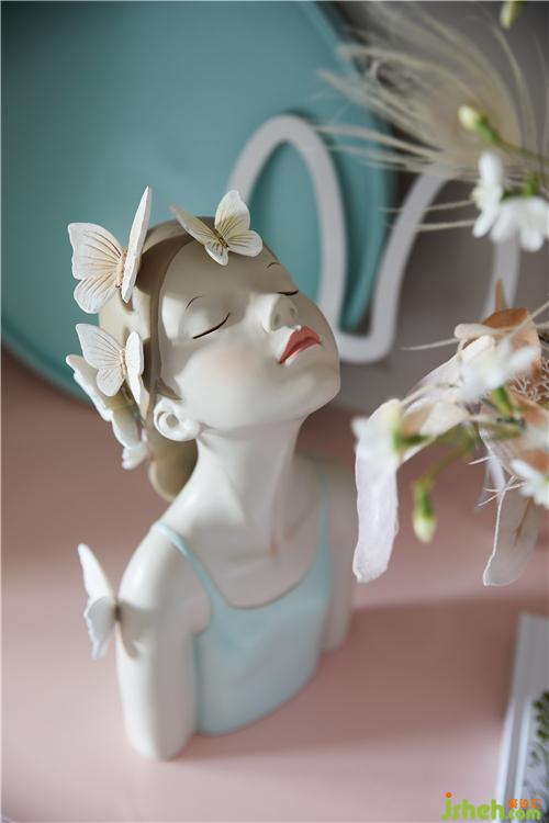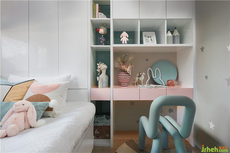 造型奇特的靠椅,可爱趣味的书立,丰富多样的摆件,满墙的星星让人仿佛坠入童话世界。桌上的小女孩仰头合眸宛若精灵,蝴蝶依偎于身旁,他们吟唱着夜色,吟唱着绿色的梦。