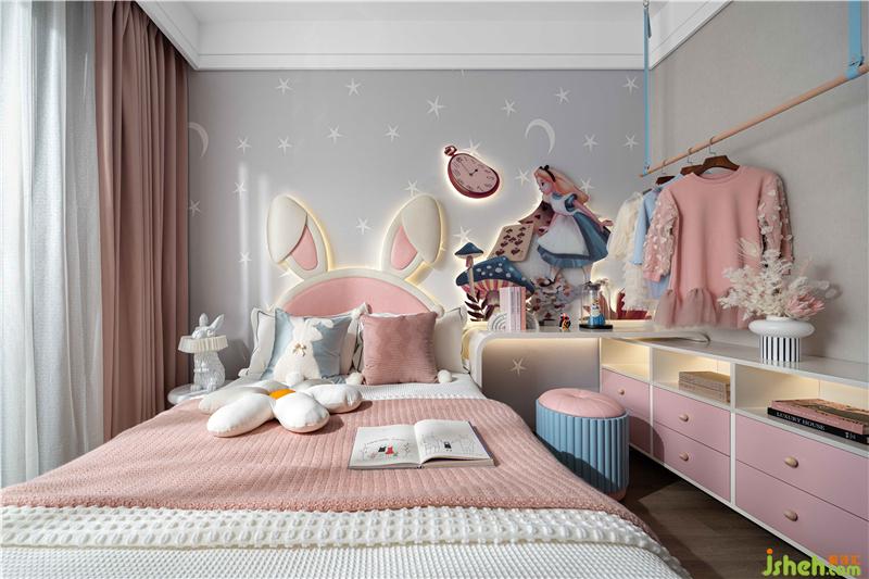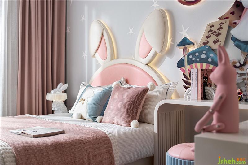 女孩房以爱丽丝荒诞又美好的故事为灵感,创造出天马行空的儿童梦境。可爱天真的小兔子穿梭其中,爱丽丝立体书屋,扑克牌红卫兵等趣味元素闯入眼帘,童话的钥匙,打开了奇妙的微小世界。