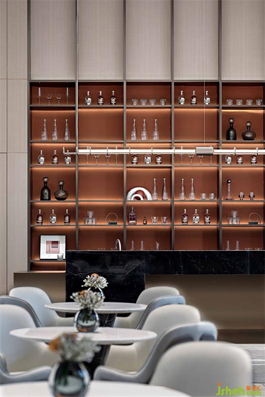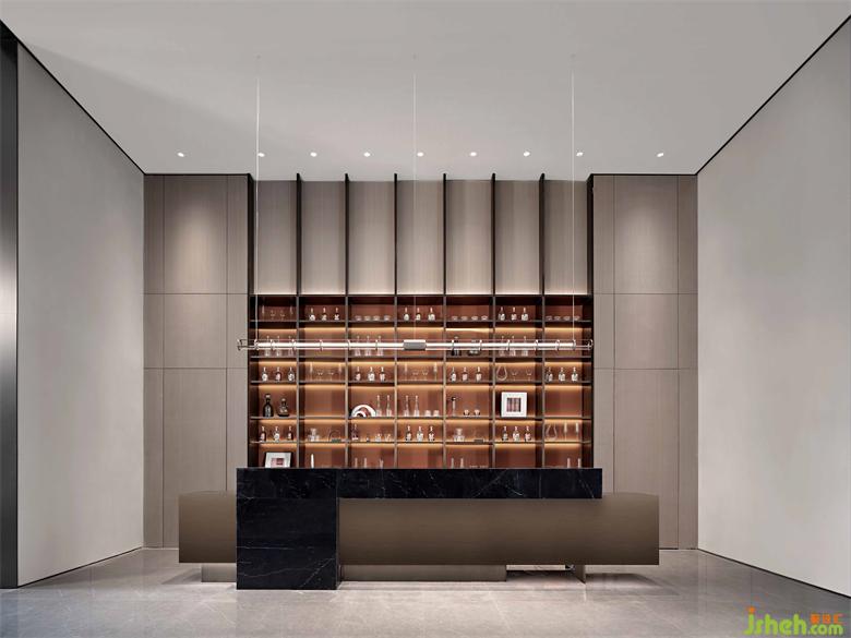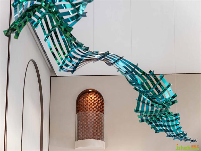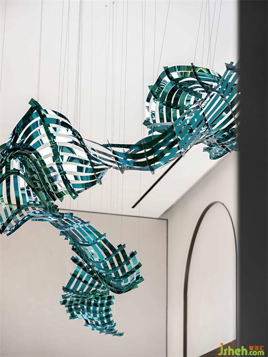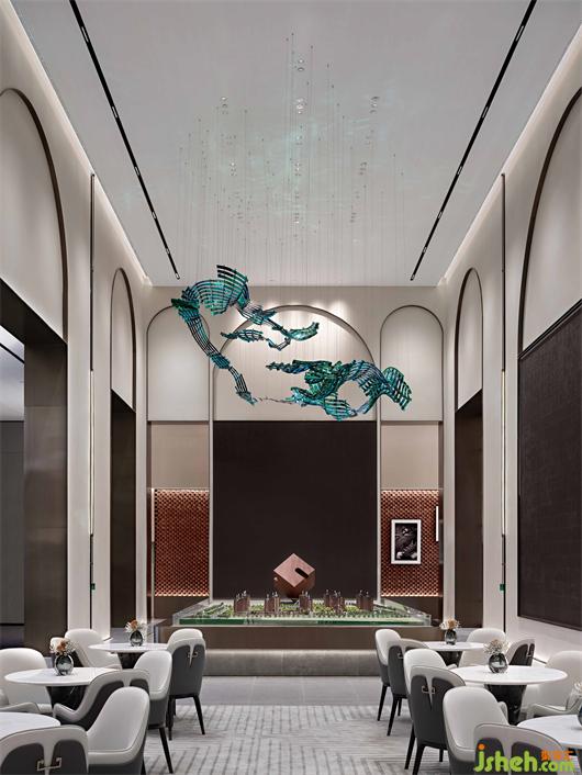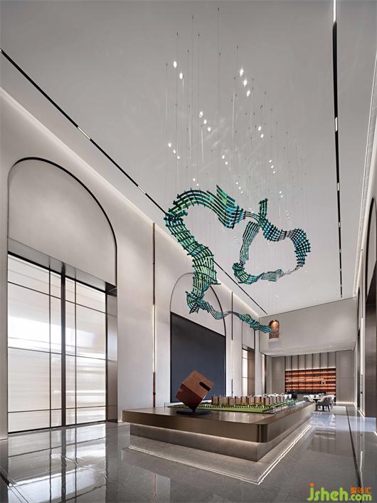 哈尔滨售楼处设计师于沙盘区的顶部创造内生空间,用艺术的手法,型构出松花江的蜿蜒态势,晶莹闪烁的姿态也完美呼应了「冰城」的城市特城。