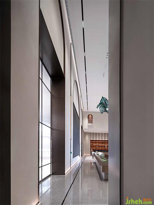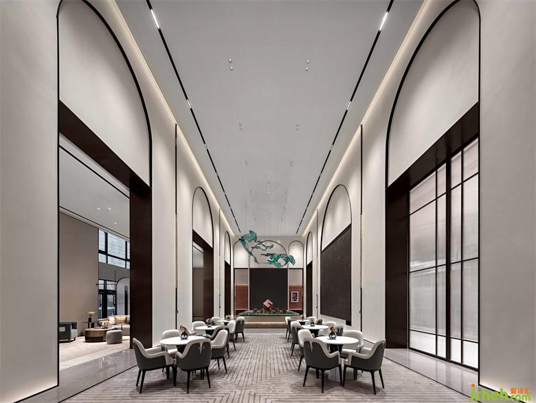 空间富有气势地挑高,数个圆拱形门洞将大厅围合,折线与曲线结合处理,使空间节奏富有层次感。简洁的设计,无需过多的装饰,用线条和留白表达具有东方意蕴的审美。
