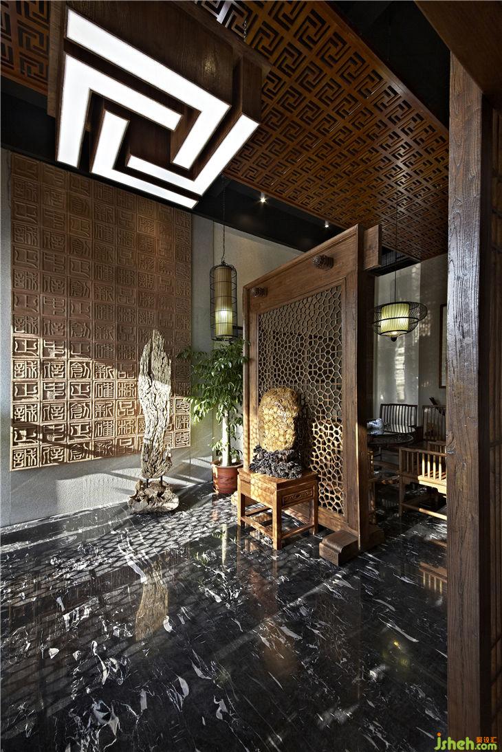 门面以酸洗成凹凸亚光深灰色的天然中国黑花岗岩石与厚实自然的榆木为材料,整体稳重而古朴;双扇顶天立地传统纹样的木格门扇配上青铜门环极具冲击力,让人感受到中国传统装饰的力量,引发人们怀旧情愫,历史瑰宝与儒雅文化蕴含其中,东方神韵尽显;大门两侧的全玻璃门在古式立柱的烘衬下更显现代与古老的融合,是中华文化历史内涵与现代时尚生活相互交融。