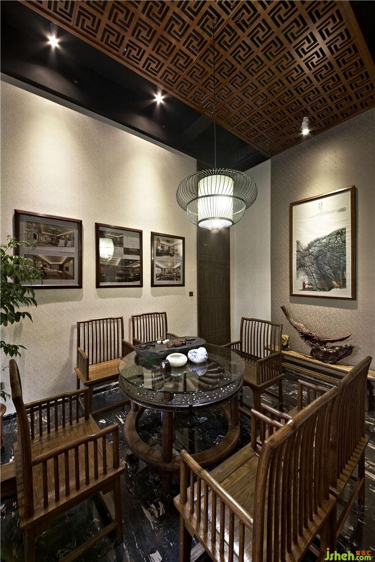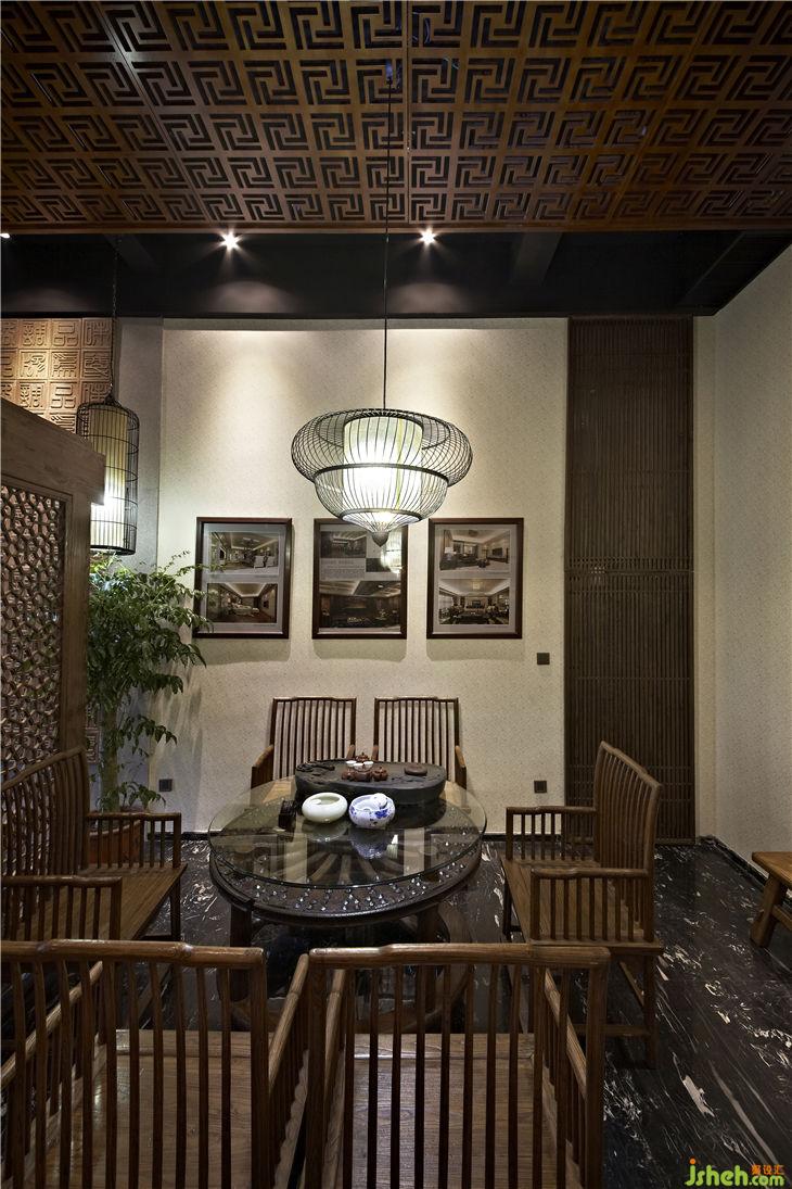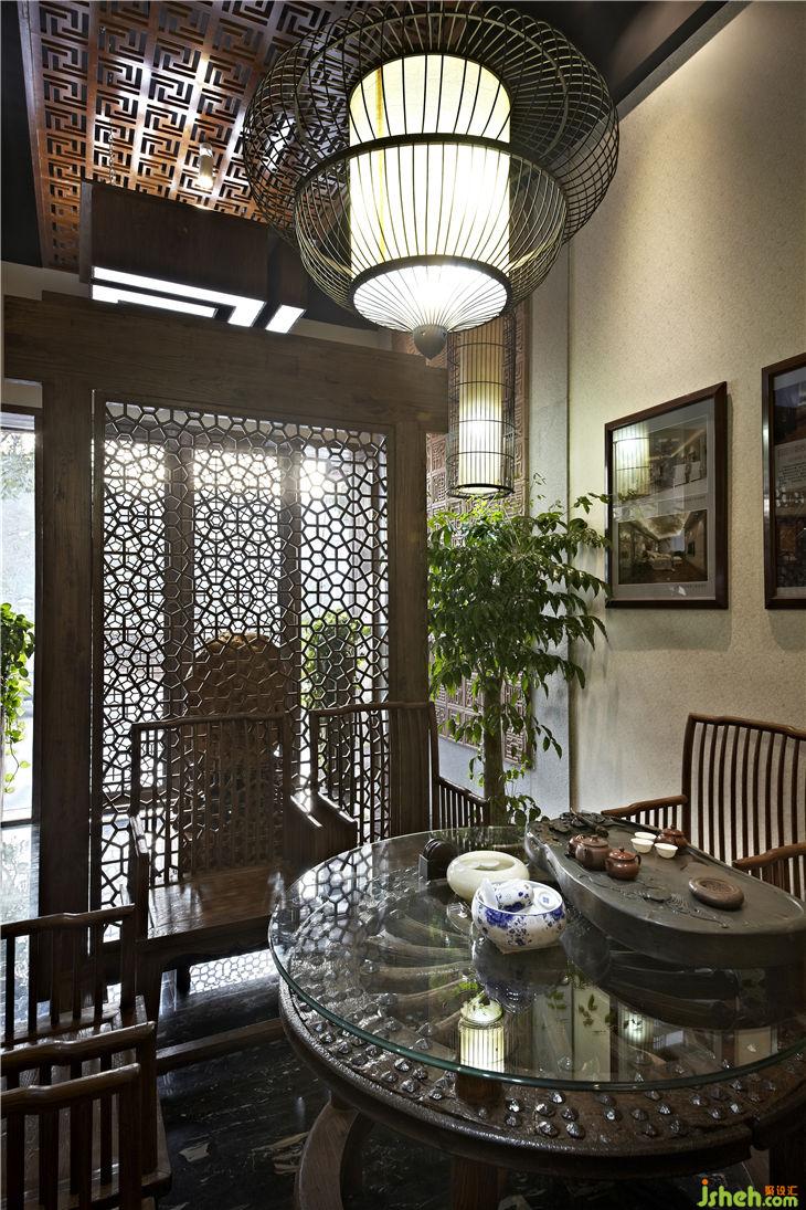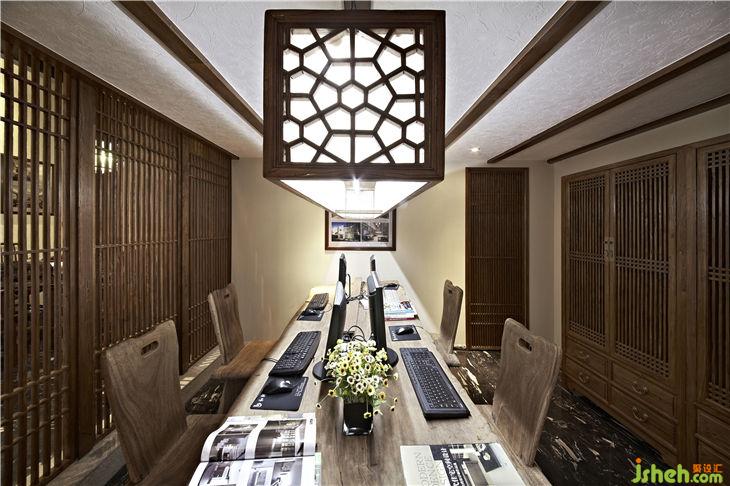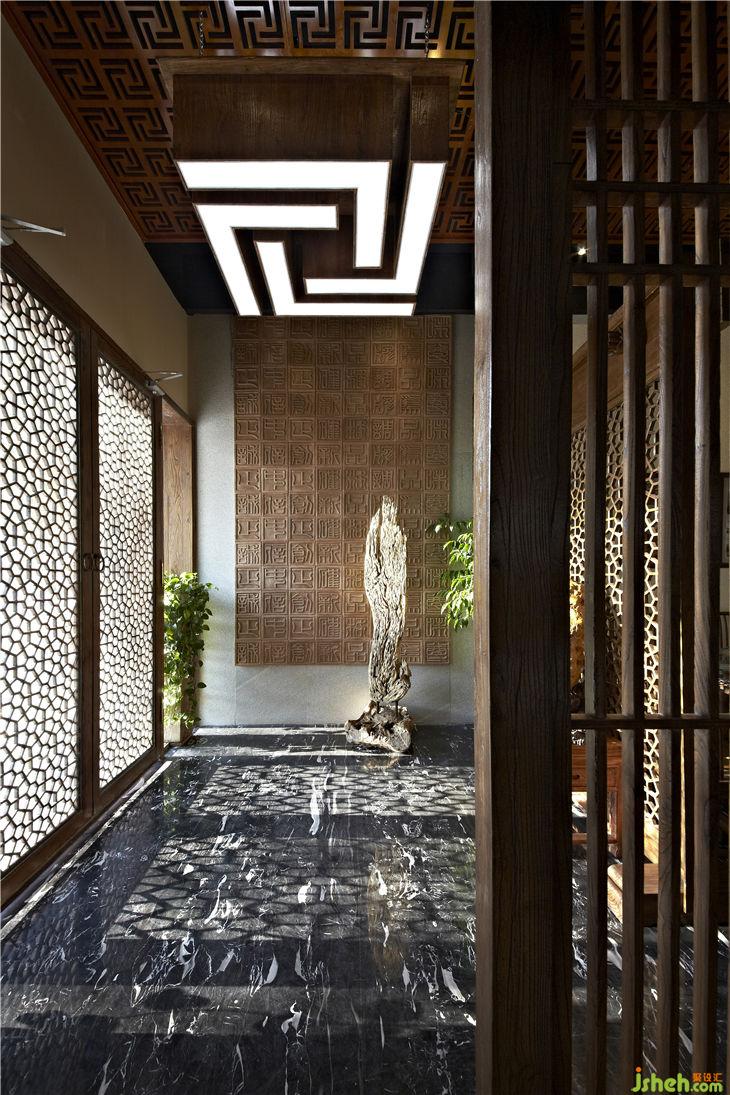 进门榆木花格屏风前摆放着一块纯天然的竹叶纹肌理的潮州腊石,敦厚而精细;装饰在门厅天花上正格设计标志的大灯与左侧整面墙的一块块雕刻着篆书汉字的陶砖是正格设计企业文化的释义,古老陶砖元素如神来之笔,释放出一种文脉、一种理念,传达一种正格文化精神。
