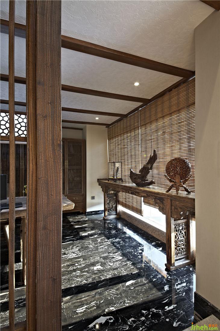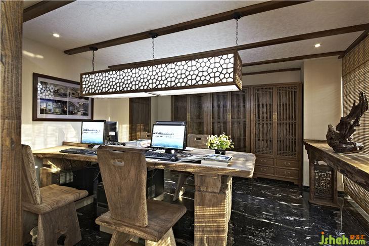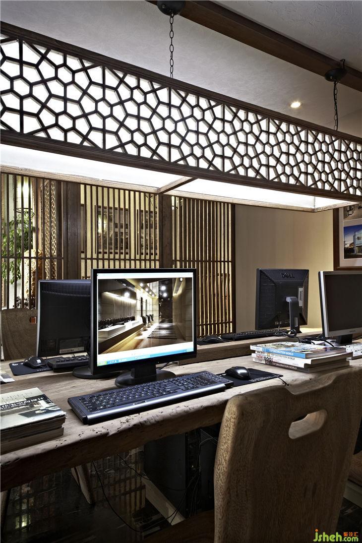 榆木屏风后是接待区,品茗圆桌是古老马车轮改造而成,失去原来价值的马车轮恰到好处的找到它的栖息地,静静地诉说历史的变迁和岁月的悠久;纯自然的树干工作案台,不加任何修饰、雕琢,流露出木质自然的本色,树皮的凹凸及自然肌理毫无掩饰的展示,宛如素面美人的清纯和轻盈,把设计语言还原到最原始的纯粹和简洁。落地玻璃窗户挂着竹帘,阳光透过竹帘缝落在玻璃窗下古老的案几上,青翠的绿萝、典雅的青花瓶,似乎在相互倾诉!岁月无声,而古老的设计语言、设计元素还在延续,还在体验……