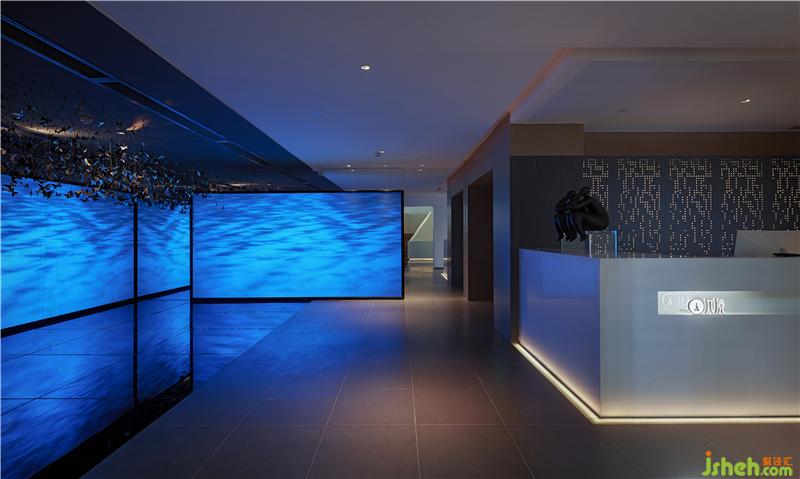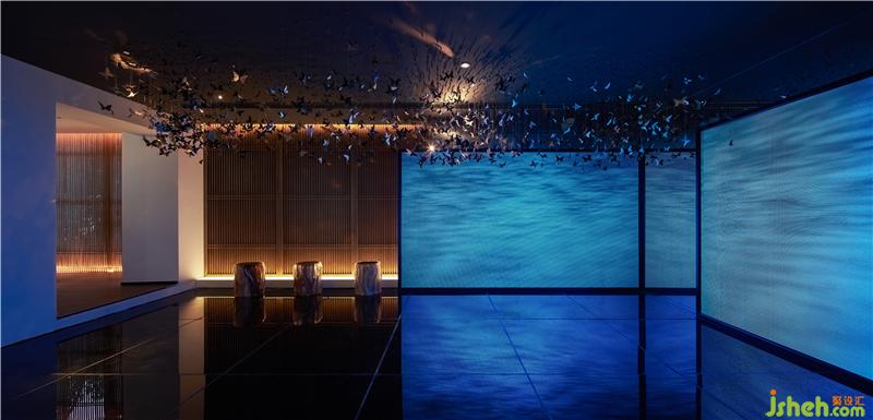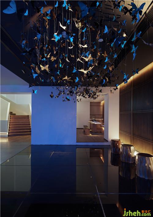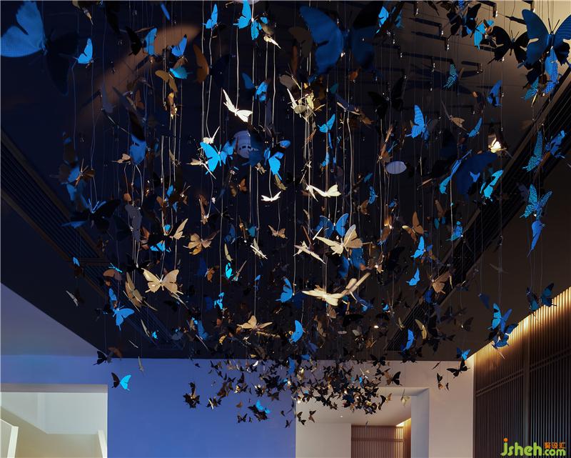 二楼等待区,设计师持续遵循“九重景、九重境、九重品”的理念,中魂西技、去繁就简,打造以山水为脉络、以自然为心,以树石为核,以人为尊的空间精髓。漫天飞舞的蝴蝶,在蓝色的光景屏幕的衬托下有着轻松、静谧的调性,更在冷光与暖光的冲撞、融合过程中,烘托出令人沉醉的绝美空间。整个空间以自然为设计重点,透过大量木作、灯饰、思考人生的雕塑等物件,刻画出细腻的生态质感,让人沉心静气、宁静致远。