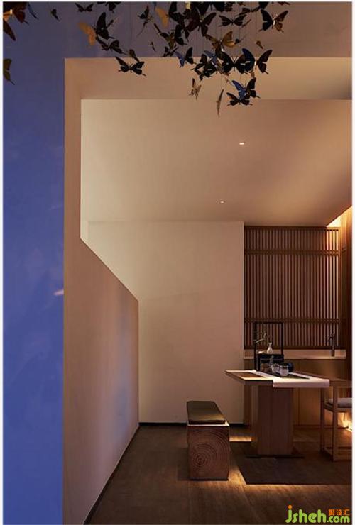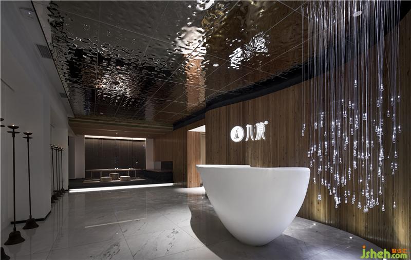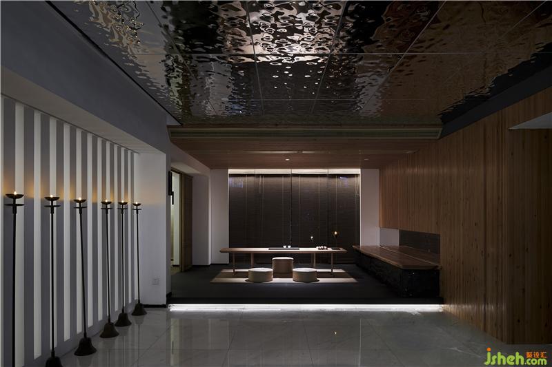 “洗尽古今人不倦,坐拥九曲品香茶”,与服务台相连的休息茶座映入眼帘。“一卷书、一盏茶、一炉香,食进千古茶,品悠九境韵。”在这质朴无华的空间一隅,大胆的采取了中式借景的手法,从人审美和功能需求出发,突显出现代人对生活精致追求和惬意生活的真切感受。会所设计