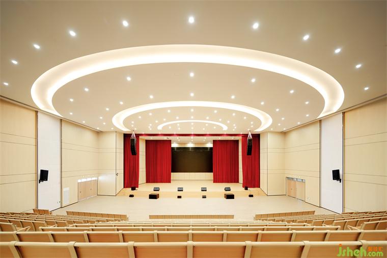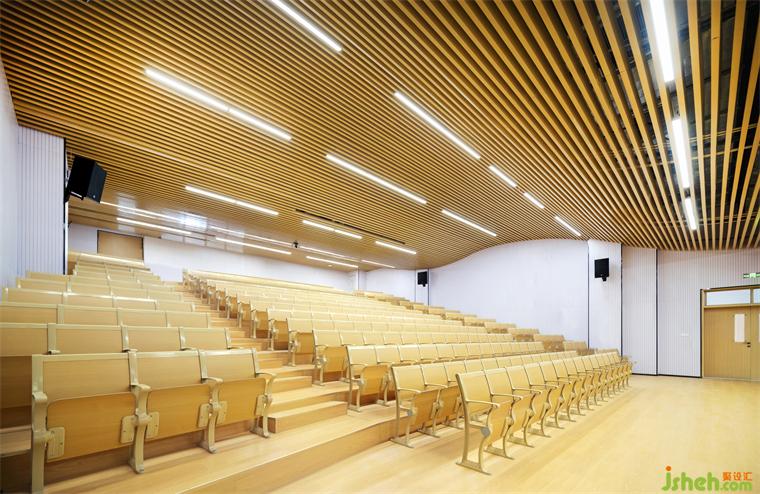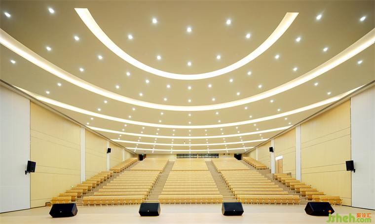 报告厅的设计考虑了多个方面,既注重了声学效果的提升,又实现了空间层次的划分和视觉感知的扩展。人性化与精细化的细致考量,报告厅间隔分布穿孔吸音板,灯光在满足照明条件同时划分空间层次拉宽整体视觉,选用的材料与座椅颜色最大程度保证了声学舒适度与空间美感、秩序感。
