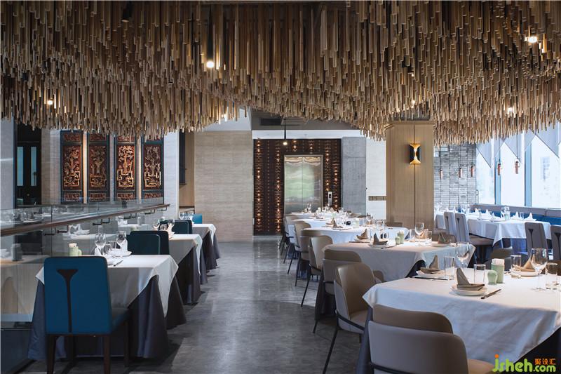 步入餐厅,一层主要作为公共空间使用,以散坐形式存在,中心区域特别设置了中央水景。The first floor of the restaurant is utilized as public space with spread-put seats. Water decoration has been installed in the center of the premise.