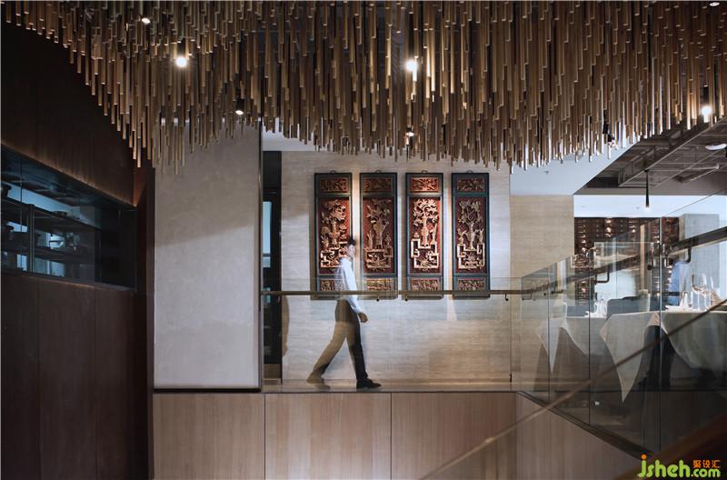 二层墙面上吊挂了四幅江南木雕花板,是业主无意间收来的旧时精致之物,置于当下的现代环境之中。Four sculpted panels are hung upon the wall on second floor. These are delicate collections of the shopowner.