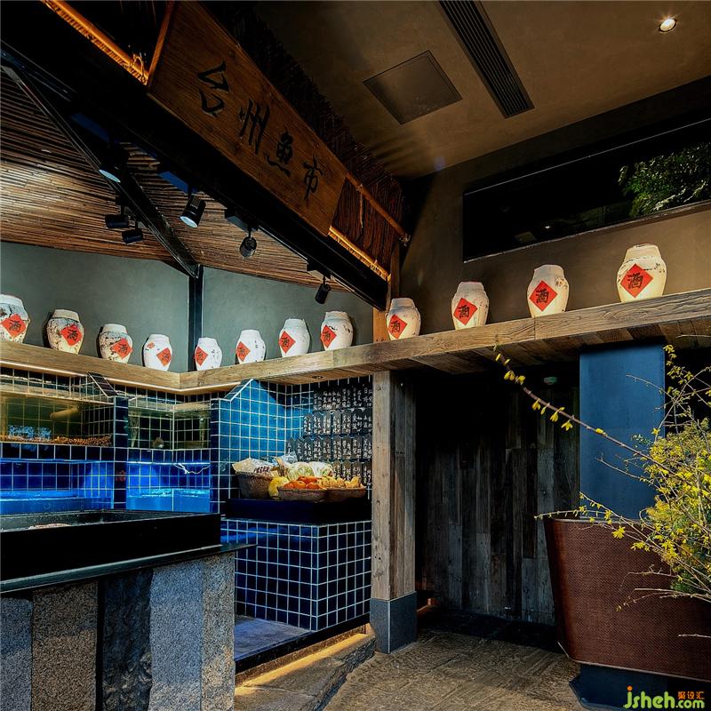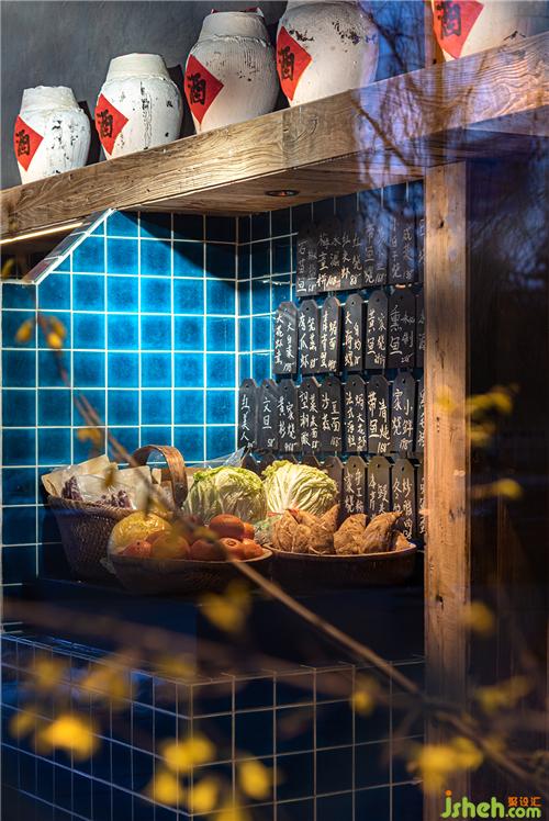 虽然餐厅空间有限,但在金融街,人们对充满市井烟火的好奇和需求要远远大于对一间酒吧,而两种截然不同的经营体验也会在同一个空间中形成冲突。于是,在粗矿的拼接青石板墙内,老木头搭出海鲜档的结构框架,竹帘、青石条、水泥、水蓝色方砖还原了档口热闹的氛围,陈年老酒、菜篮、鲜活水产和氤氲的水汽无一不是人声喧闹的市井底色,在暖黄色的灯光里,这一块被框起来的“烟火气”兀自站在金融街的繁华里,甚至有点不合群,却格外引人入胜。