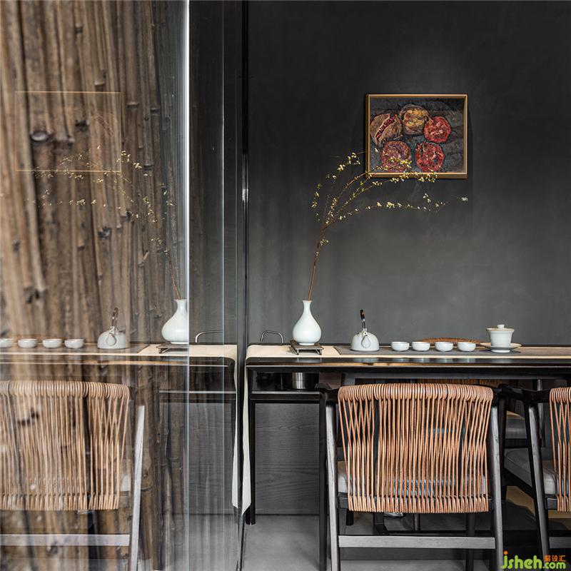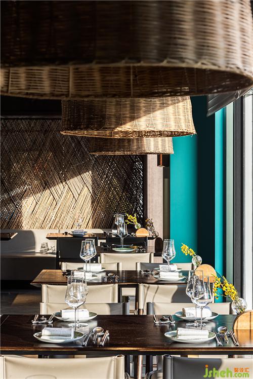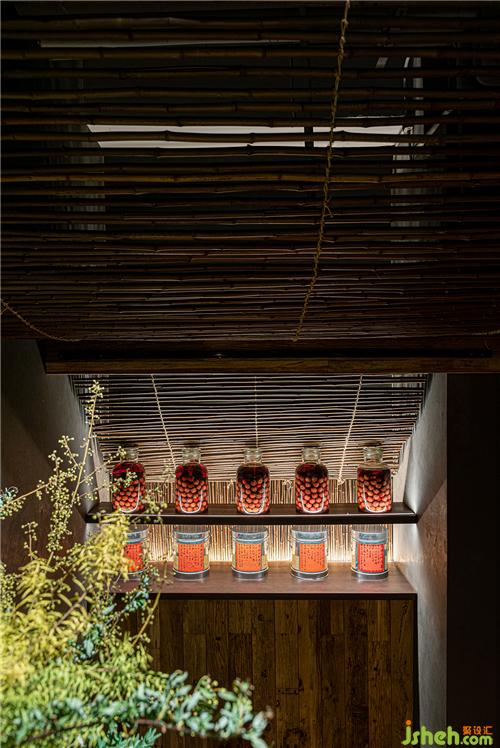 整个餐厅内,经年的天然材料重新编织、切割又组合,在青灰色的肌底上作为结构,也作为艺术。看似反常的设计策略在禾苑中赢得了绝佳效果,北京餐厅设计阳光从窗外投入依次落在交叠编织的竹隔断上,再蔓延至深浅交错的老木头、青石板、水泥地面、皮质餐椅、丰茂植物,本不大的空间内呈现出丰富厚重的层次质感。