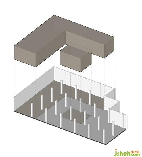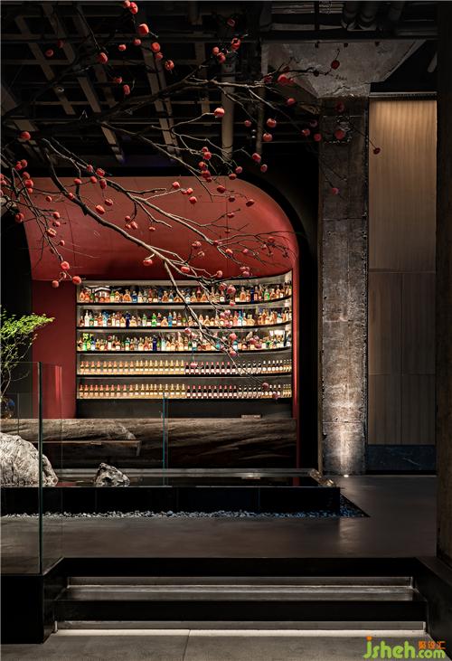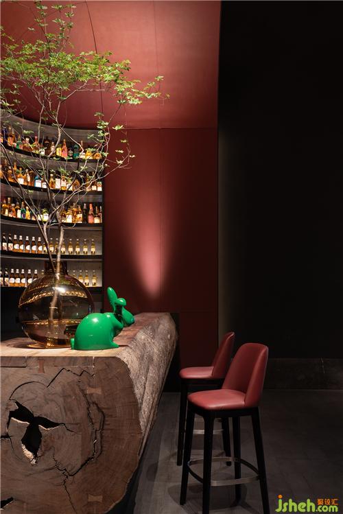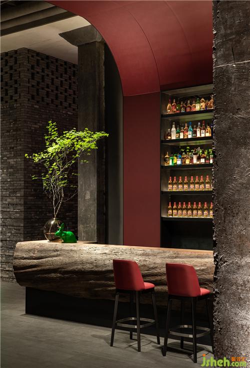 红色吧台区构建出另外一个场景——5.2米高的红色立面向上延伸、弯曲成弧形顶面与建筑结构相接形成灰色水泥盒子中一个嵌套的模块,古老京城似乎正从这一隅慢慢醒来,被注入鲜活涌动的生命力。