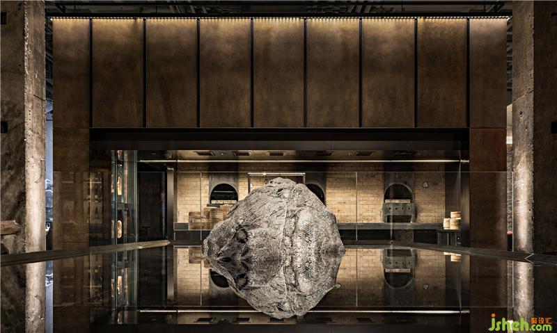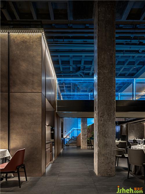 进入晚餐时段,大面积渲染的蓝色灯光从天花及部分墙面“溢出”,如同数字化的夜晚天光。当代设计手法、传统地域文化与旧建筑符号交汇成动态的时间线,和进入空间的每个人发生交互。