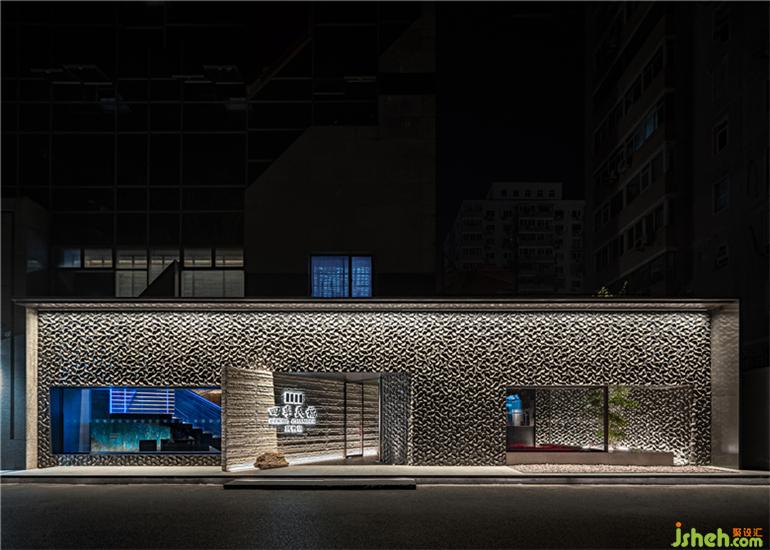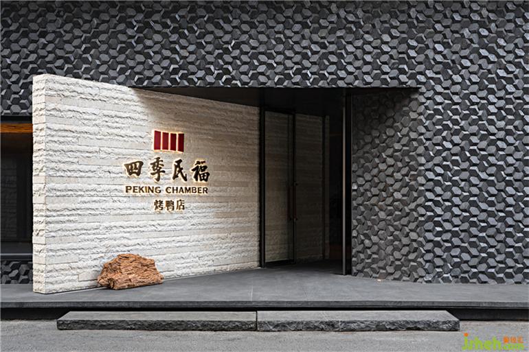 抵达新店入口,需要沿向军南里并不宽阔的小路向西稍作步行,原有的店门虽然很大,但少了柳暗花明的志趣,正向南开也使它并不引人注目。于是,设计师将门头改为窄门,并向南旋转一定角度,于是所有进入巷子的车流和人群都能被门头吸引,深色石材的大胆使用让规则的建筑结构更富有力量,从略显狭小的门口进入,是暂时离开城市的探险。