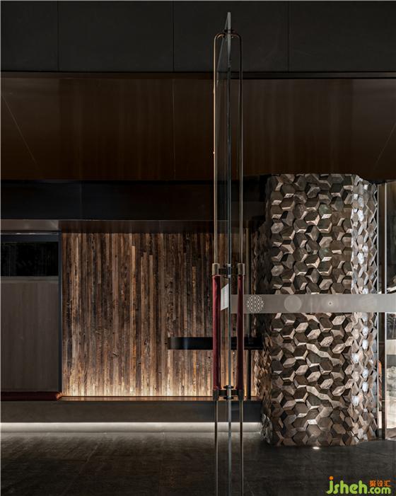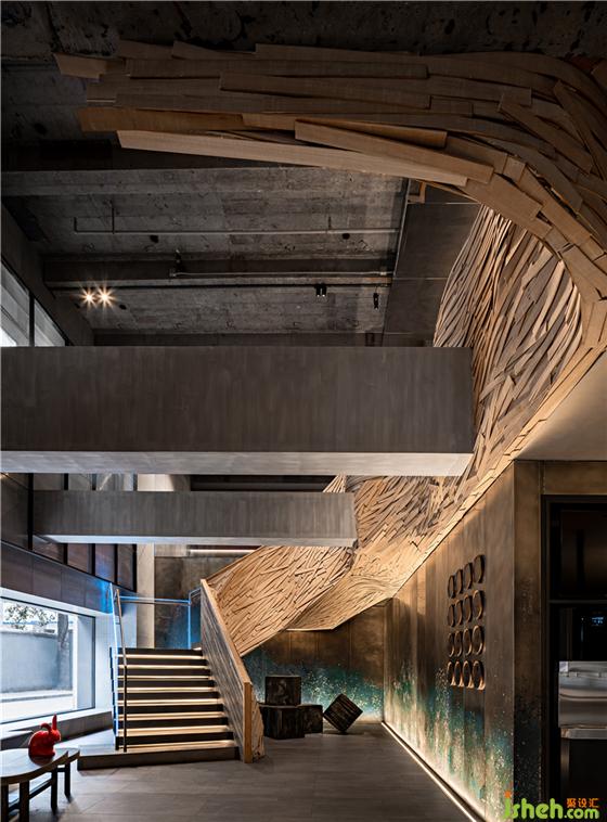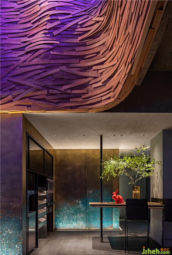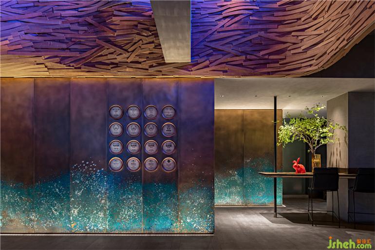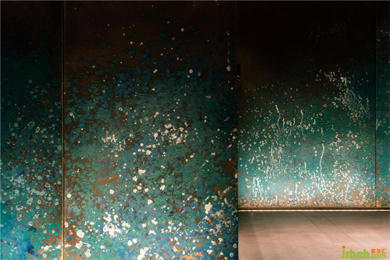 经过多次腐蚀结合“泼彩”实验,设计师团队在现场制作出了千变万化的“泼彩”效果铜板,作为立面材料大量应用在空间中,松石色纹样无穷变化,如同涌动的湖底,亦或是大写意的层峦叠嶂。