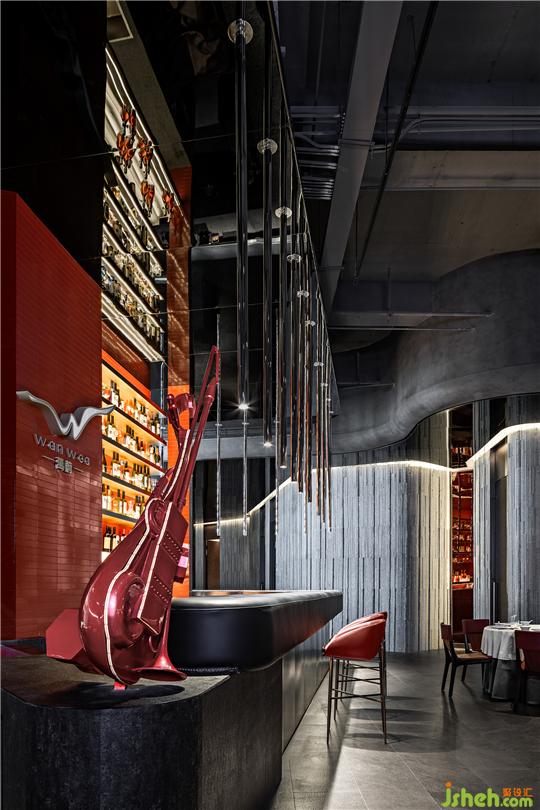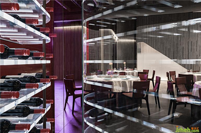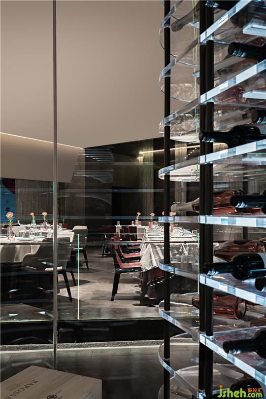 散座区中央,从天花向下插到地面的酒窖“雕塑”是整个空间的视觉中心。餐厅设计在冷静色调中,半透明的亚克力酒架与正红色墙体一圆一方,在层叠阵列的灯管管线烘托下点亮,也点燃了整个餐厅。