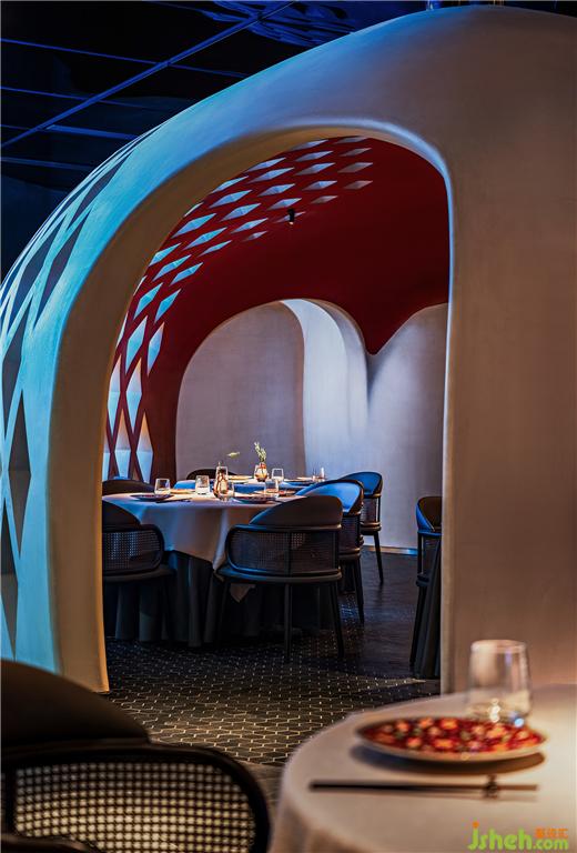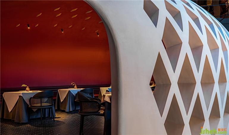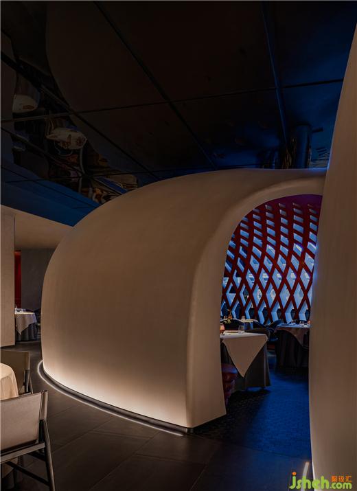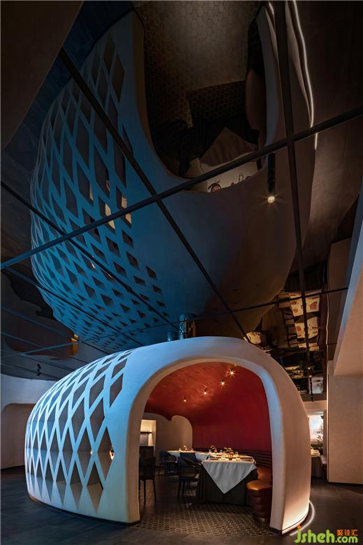 餐厅设计受限于施工难度和成本,腔体建造未能以3D打印技术实现,而是以更传统的钢筋结构层层搭建,现场对形态、曲面及细部的校准同步进行,这一具有实验性的创造由许多人共同完成,最终得到和设计原稿接近的结构体。