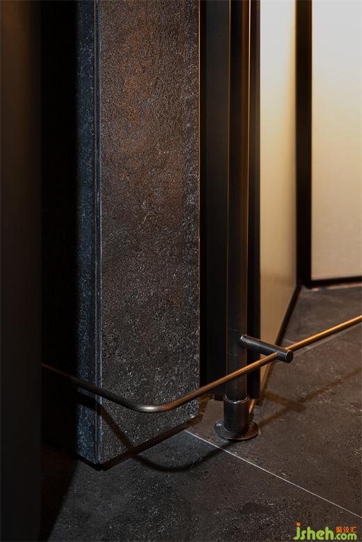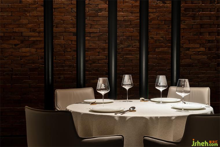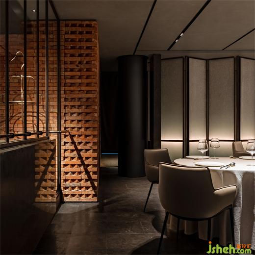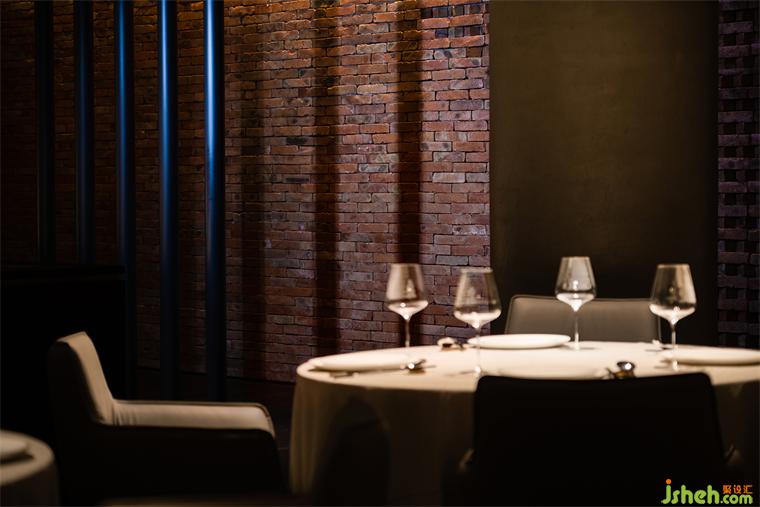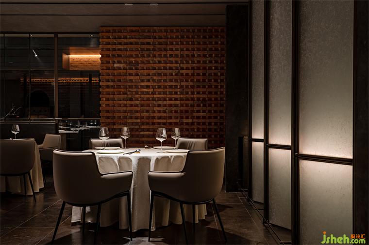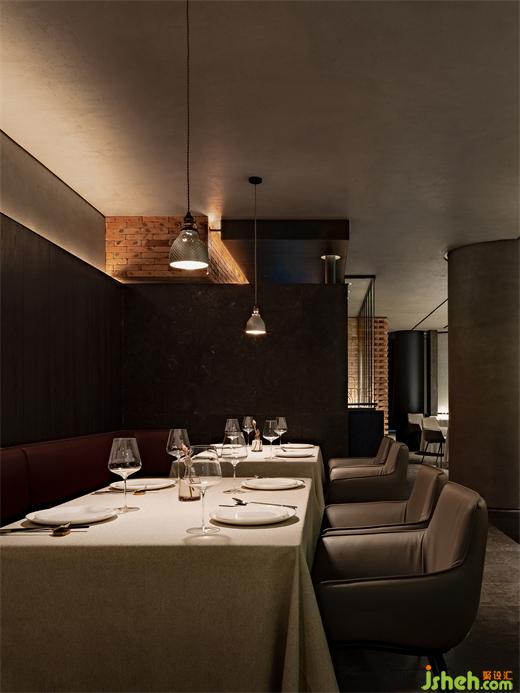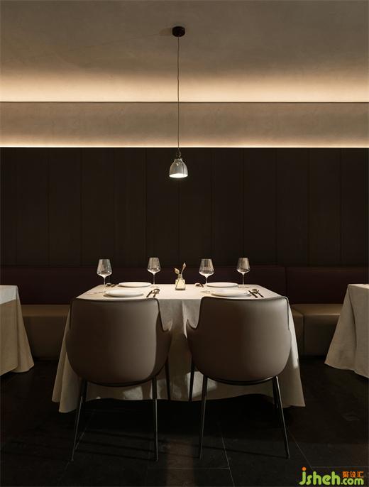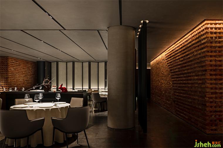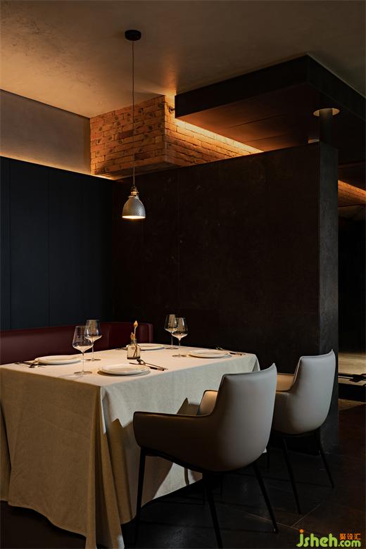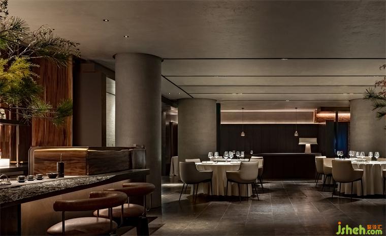 像放映一卷珍藏已久的时间底片,空间沉入一块深沉典雅的布景中,从进入的一刻便重置了人们之前的空间体验。餐厅设计在灰色基调中,天花使用了较浅的灰和大地色,灯光如月光漏下,表面肌理细节在柔和的光影下无尽变化,这一设计弥补了地下空间无自然光照的劣势,并巧妙地借暗调营造令人舒缓沉浸的氛围。