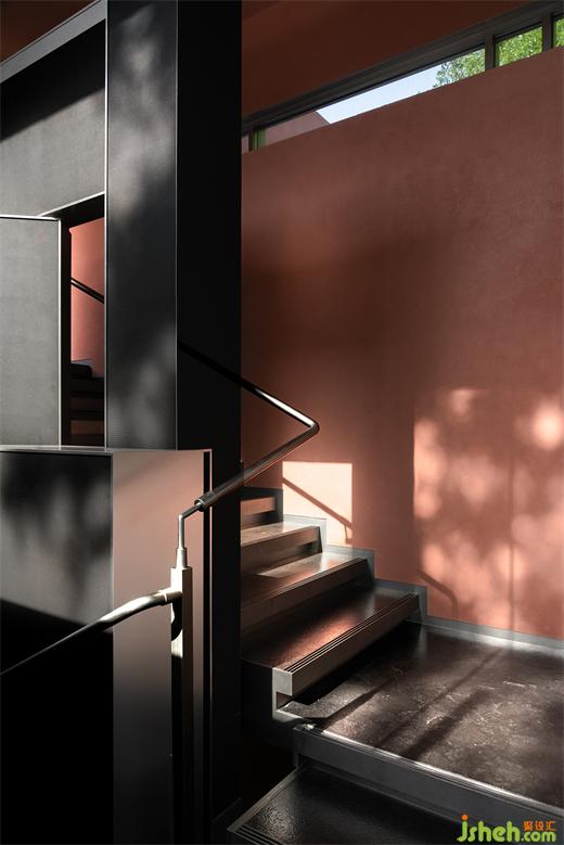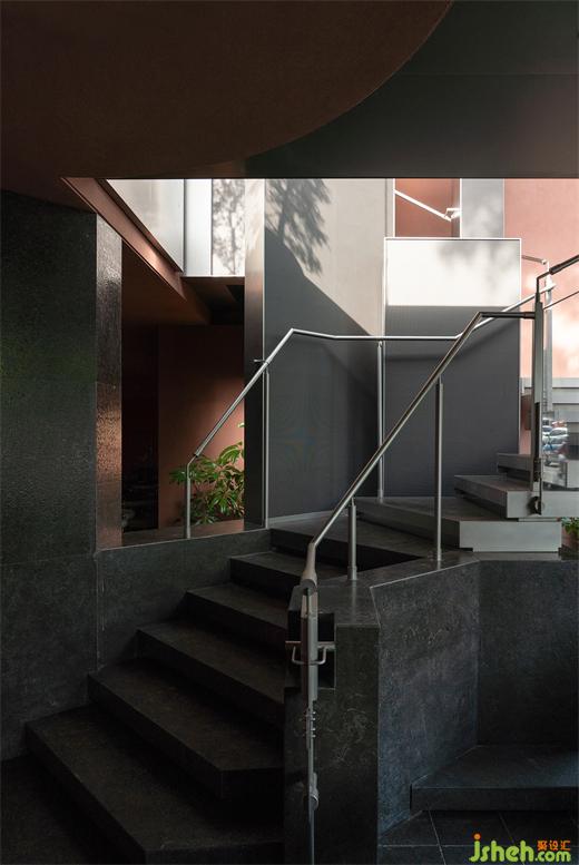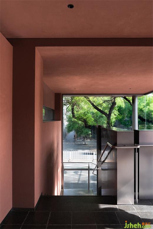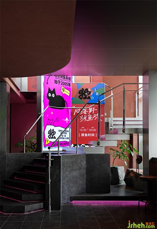 烤鱼餐厅设计用钢筋和玻璃做建筑骨架勾勒出横竖两个半开放的盒子,透过玻璃能看到简洁的扶梯组织起建筑动线并从内部连通两个空间,同时将食客引向宽敞的屋顶露台——簋街街景在那里尽收眼底。