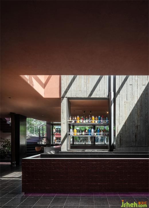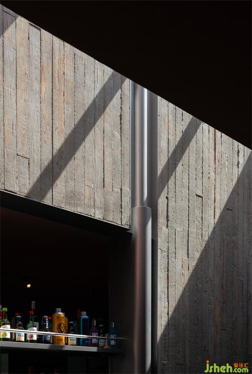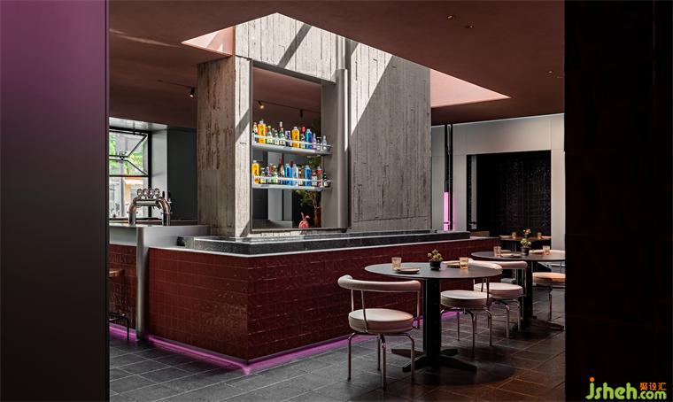 餐厅内部在设计上与建筑保持着一致的呼吸感,除了灵魂般的二层露台,垂直方向上设计师在U型吧台位置开矩形天窗,倾泻而下的自然光纵贯空间,使中央吧台兼具宴饮活力和自然韵律,流水、景观、植物片段式穿插期间,散座区因此一扫沉闷。