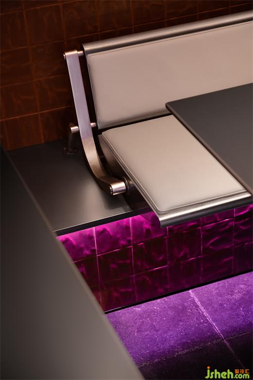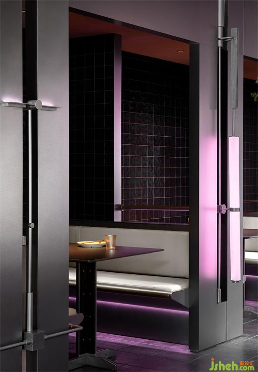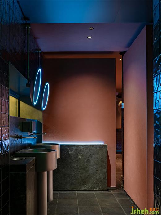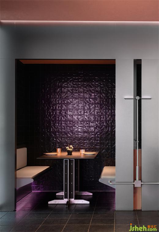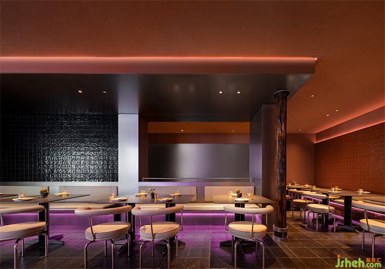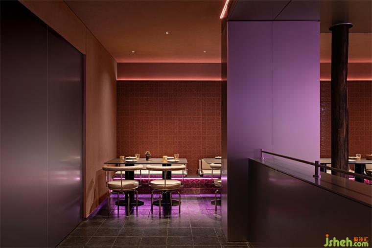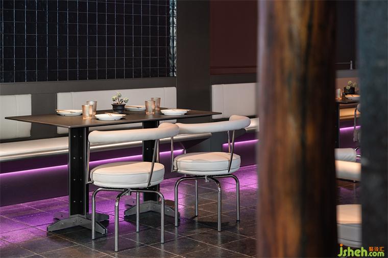 烤鱼餐厅设计师运用大胆色彩和冷峻的金属材料将空间笼罩在一种复古未来的光彩中。氛围的达成一部分来源于未来主义,另一部分则是机械所代表的现代主义,设计从近一个世纪的美学语言中寻找线索,同时也挣脱了具体的风格范式。将毫不拖泥带水的洁净和抽象赋予金属构件,结合古典奇幻的灯光,复古机械感滑向未来宇宙,自由松弛的晚餐时段是一场视觉和味觉的共同“致幻”。