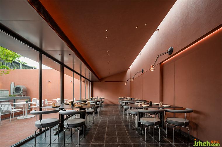 陶土色在立面大量使用,怀旧气息和自然属性使它成为不二之选,在二层露台,清爽的户外家具及吧台和它一起营造出阿拉伯沿海度假感,傍晚霓虹炫彩,不乏排队只为登高小酌一杯的年轻人,烤鱼这个看似式微的品类被包容性极大的空间体验巧妙化解。